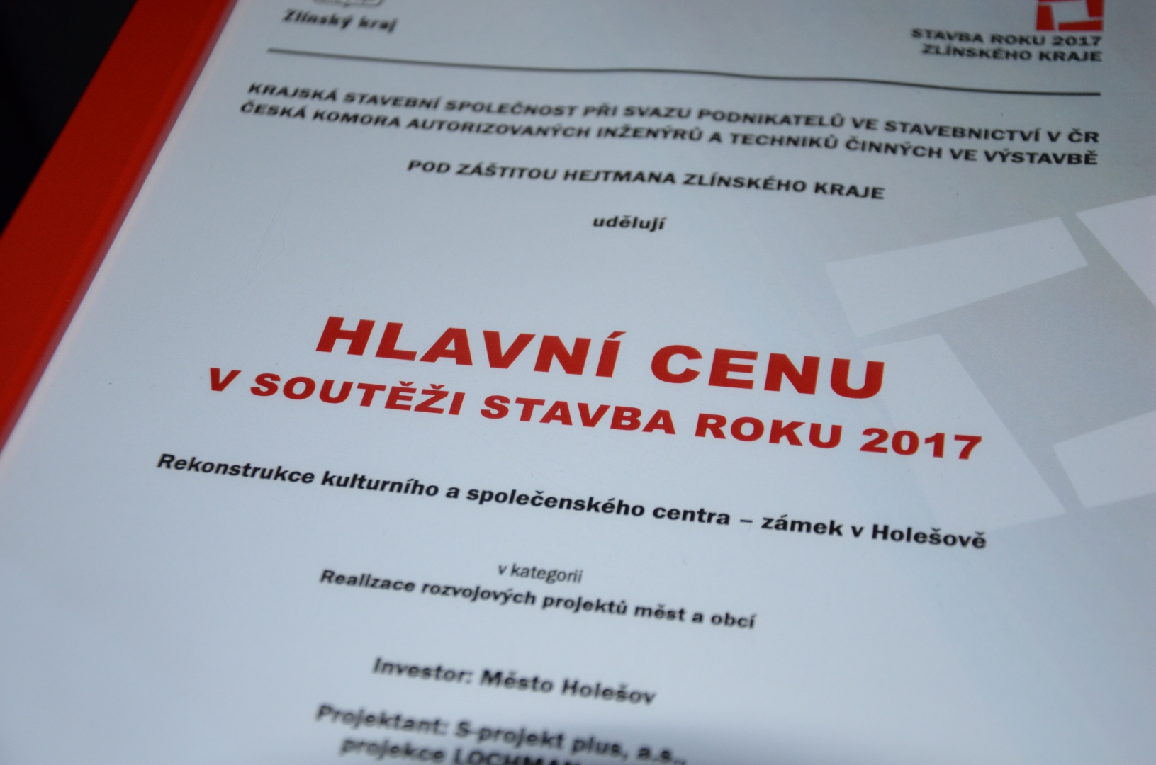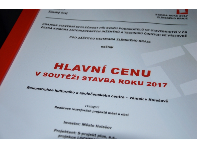 V kategorii s názvem Realizace rozvojových projektů měst a obcí uspěl holešovský zámek, který byl oceněn hlavní cenou, a může se tak zaslouženě pyšnit statutem Stavba roku 2017. Ocenění převzal za město starosta Rudolf Seifert a Stanislav Julíček, dále projektant Vladimír Lochman, autor díla Ladislav Pastrnek a další. Projekt Rekonstrukce kulturního a společenského centra – zámek v Holešově tak porazil silnou konkurenci v podobě například zrekonstruované obřadní síně MÚ v Otrokovicích nebo areálu obecního úřadu v Ostrožské Nové Vsi.