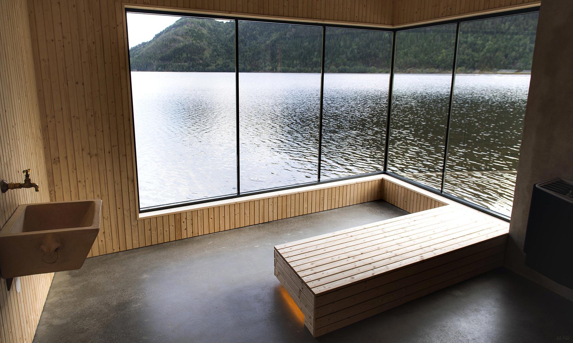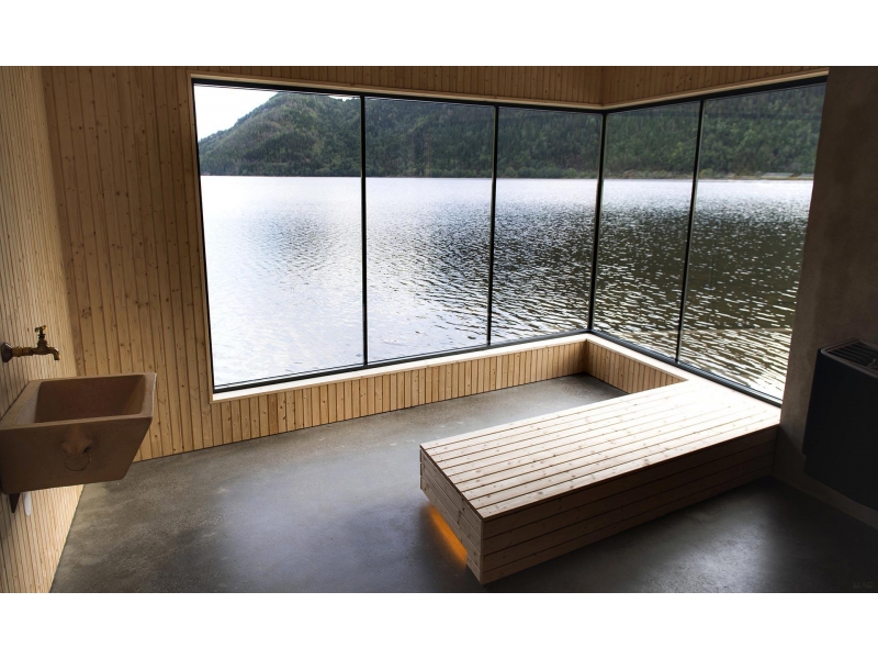 Architekti z ateliéru Feste Landskap Arkitektur vyprojektovali saunu z přírodních materiálů s jednoduchými tvary a s okouzlujícím výhledem na okolní přírodu. Tvar sauny je pak dán dvěma propojenými objemy s nakloněnými střechami. To dohromady vytváří ostrý tvar, který je odrazem tvaru hor v tamní krajině.