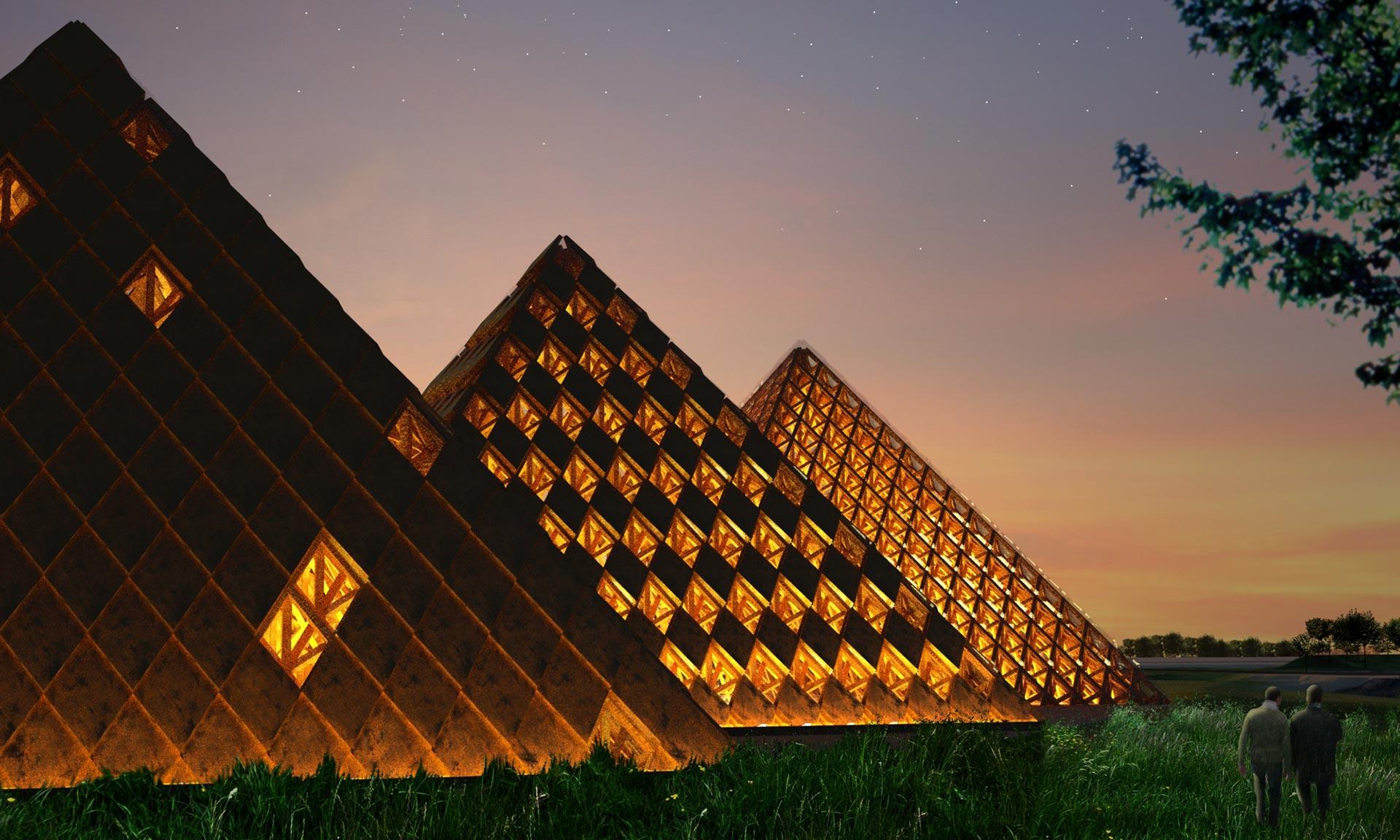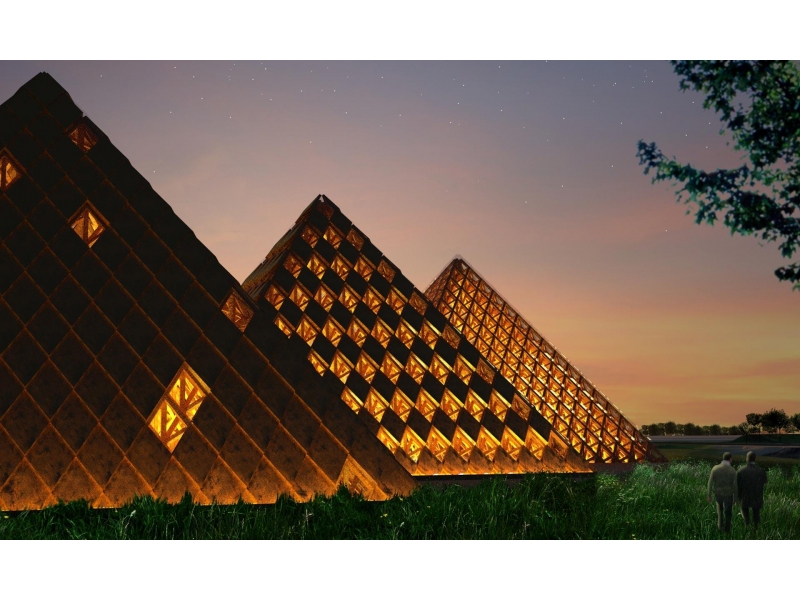 V americkém městě Louisville tak vznikne park s několika klasickými budovami, ale také třemi pyramidami. Zajímavostí je, že celý areál bude z drtivé části postaven ze dřeva a rozprostírá se okolo několika navzájem propojených vodních ploch. Není náhoda, že tento nápad vznikl u lidí, kteří pocházejí z Japonska!