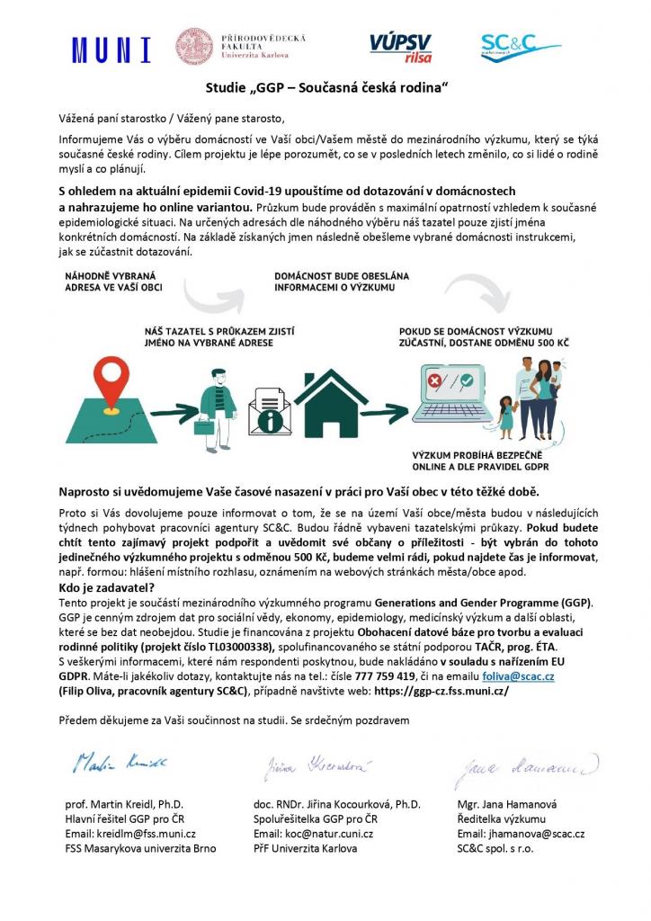 Informujeme Vás o výběru domácností ve Vaší obci/Vašem městě do mezinárodního výzkumu, který se týká současné české rodiny. Cílem projektu je lépe porozumět, co se v posledních letech změnilo, co si lidé o rodině myslí a co plánují.