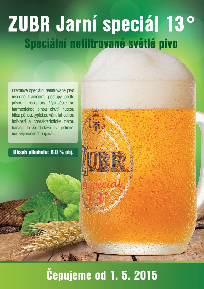 Loňská úspěšná jarní pivní novinka ZUBR Jarní speciál 13° se opět vrací do limitované nabídky pivovaru Zubr. Speciální vícestupňové nefiltrované pivo se bude čepovat od začátku května do 50 l a 30 l sudů.