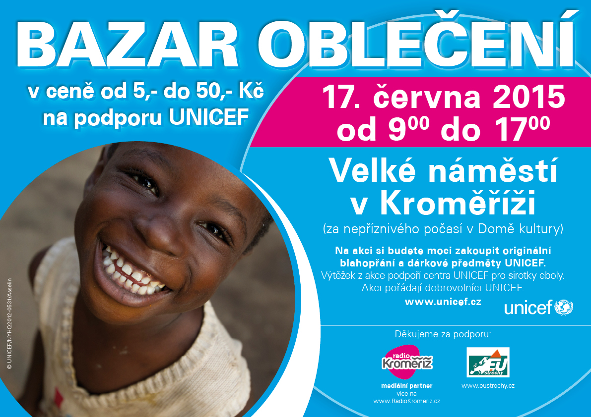 Srdečně Vás zveme na bazar oblečení na podporu UNICEF, který se uskuteční ve středu 17. června 2015 od 9 do 17 hodin na Velkém náměstí v Kroměříži (v případě nepříznivého počasí v Domě kultury).