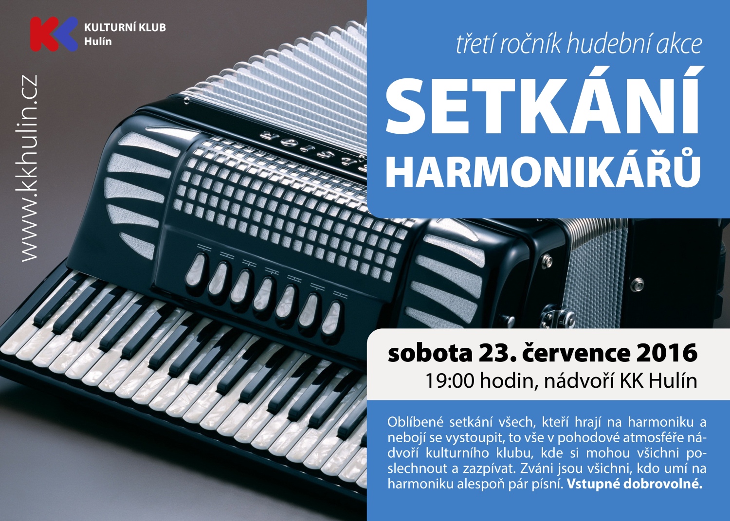 Již třetím rokem se na nádvoří KK Hulín představí harmonikáři, kteří se nebojí vystoupit a pobavit diváky. Akce se koná v sobotu 23. července od 19 hodin na nádvoří Kulturního klubu Hulín. Zváni jsou všichni příznivci dobré nálady i t…