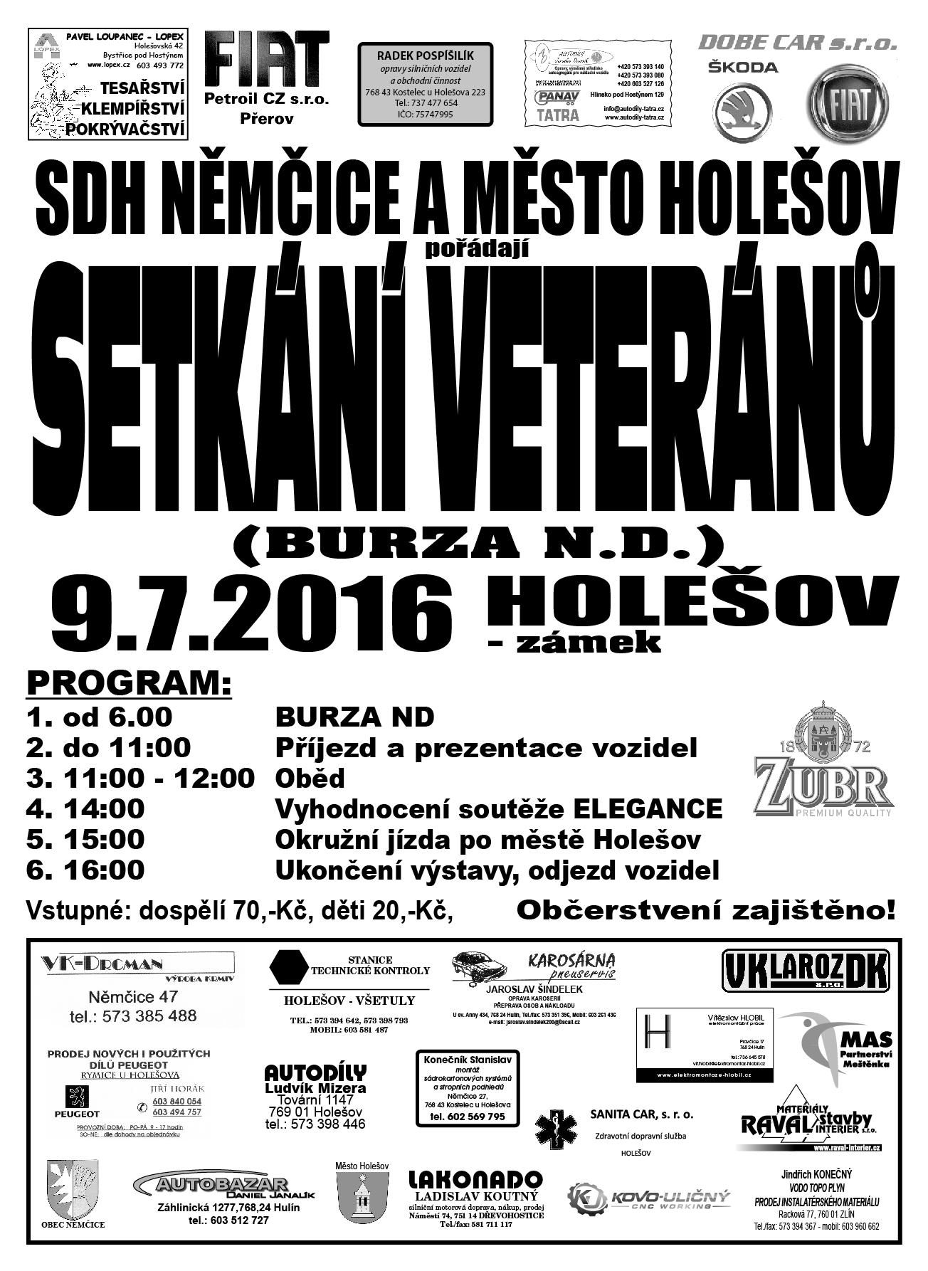 Sbor dobrovolných hasičů Němčice pořádá již 13. setkání veteránů a hasičské historické techniky v zahradě holešovského zámku, a to v sobotu 9. července od 6:00 hodin.