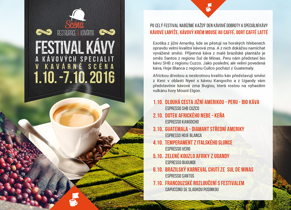 Kavárny ve Zlínském kraji i letos spojily své síly, aby podpořili myšlenku budování kávové kultury v našem regionu a společně se svými hosty oslavily říjnový svátek kávy. Zapojené podniky připravily v týdnu od 1. do 7. října doslova kávový festival – ochutnávky kávových specialit, netradičních káv, kávová menu i zvýhodněné akce. Tradičně se do akce zapojila také Kavárna Scéna v Kroměříži (Tovačovského 2828, Dům kultury).