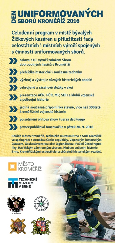Z mnoha koutů země se do Kroměříže v sobotu 1. října 2016 sjedou fandové vojenské, policejní i hasičské historie a současnosti, aby spolu už potřetí oslavili Den uniformovaných sborů.