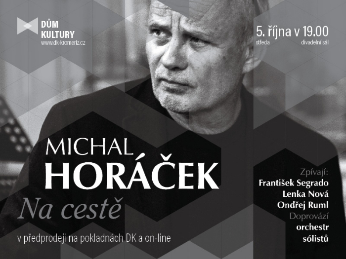 Do kroměřížského Domu kultury přijíždí s výjimečným koncertním projektem "Na cestě" textař, básník a producent Michal Horáček. Autorský recitál ve středu 5. října od 19 hodin v Domě kultury nabídne písně z tvůrčí dílny Hapka & Horáček i ze spolupráce s dalšími hudebníky - „produkty s doživotní zárukou“, které už dávno prověřil čas, rozhlasový éter i zájem posluchačů mnoha generací.