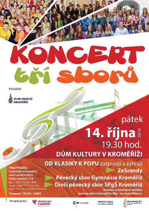 Jedinečné vystoupení tří pěveckých sborů se usluteční v pátek 14. října od 19:30 hodin v kroměřížském Domě kultury. Od klasiky k popu zazpívají a zahrají soubory Zesrandy, Sbor gymnazia Kroměříž a Dívčí pěvecký sbor SPgŠ Kroměříž