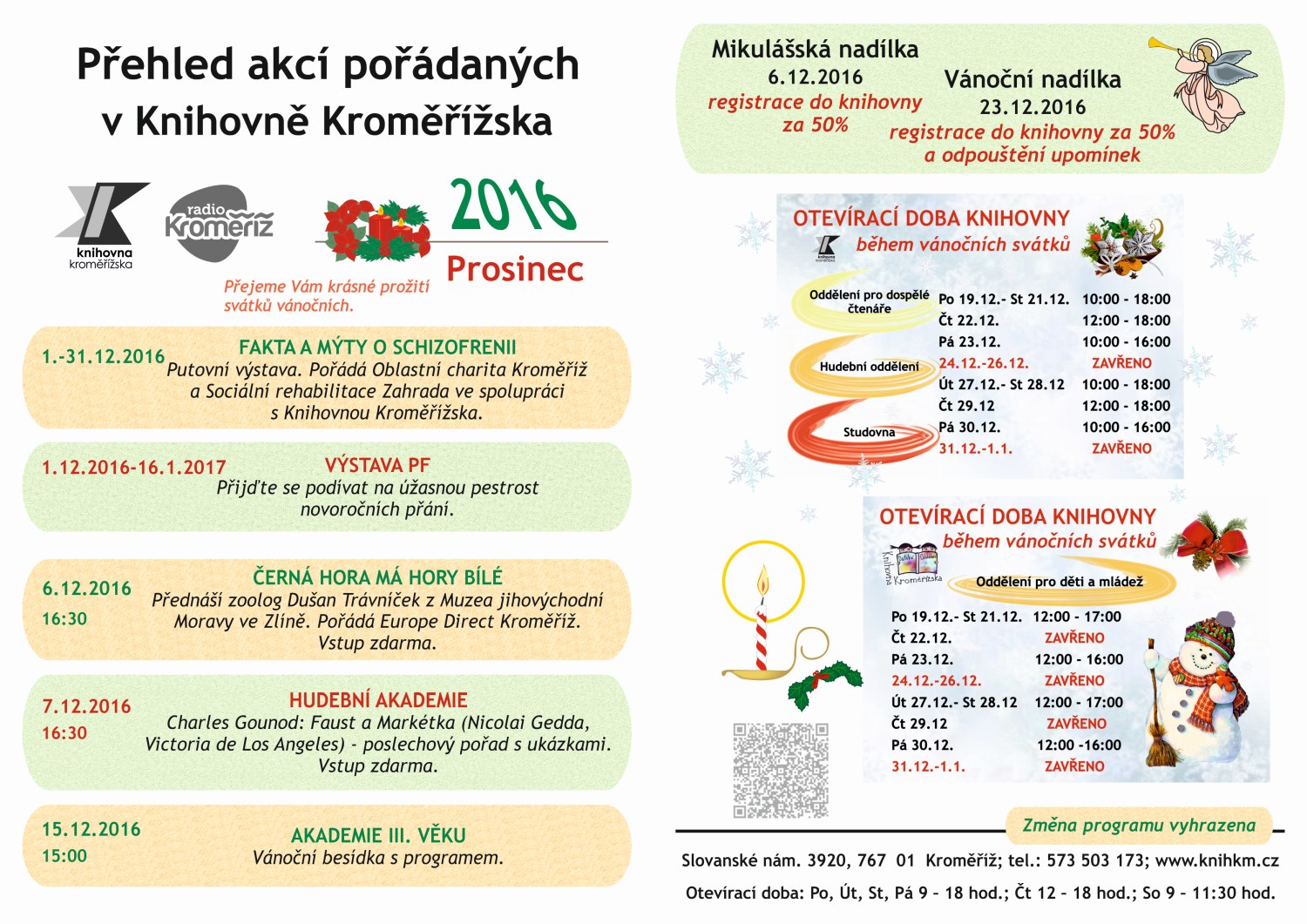 Další bohatý program připravila na měsíc prosinec nejen pro čtenáře Knihovna Kroměřížska. K vidění je například nejen výstava originálních novoročních přání, ale jsou připraveny také zajímavé odborné přednášky či doplňkové akce v podobě Mikulášské a Vánoční nadílky. Podrobný program měsíce prosince v knihovně naleznete v galerii pod článkem.