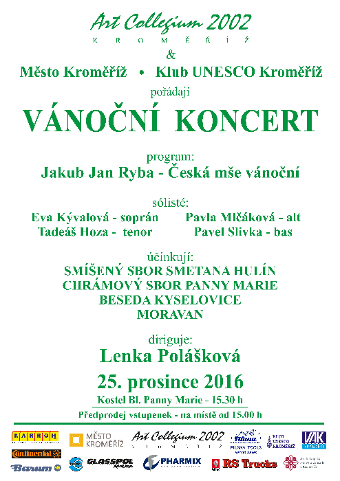 Již počtrnácté zvou sdružení Art Collegium, 2002, Město Kroměříž, klub UNESCO Kroměříž a Dům kultury v Kroměříži na tradiční Vánoční koncert do kostela Nanebevzetí Panny Marie v Kroměříži na Boží hod vánoční, 25. prosince v 15:30 hodin.