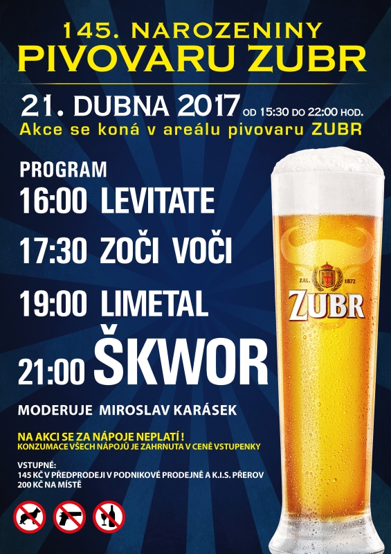 Výjimečnou oslavu, která již tradičně otevře pivovarskou sezónu zahájí narozeninová oslava pivovaru Zubr. Uskuteční se v pátek 21. dubna od 15:30 hodin v areálu pivovaru v Přerově. O tom, že bude akce speciální svědčí i významné výročí pivovaru - oslaví totiž 145 let své existence. Návštěvníci akce se mohou těšit na neomezenou konzumaci nápojů včetně ZUBR Narozeninového speciálu a hudební produkci, kterou zakončí koncert kapely Škwor i soutěže o ceny. Celou akcí vás bude provázet moderátor Rádia Kroměříž Mirek Karásek.