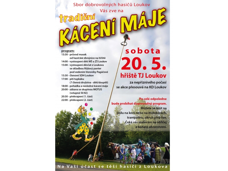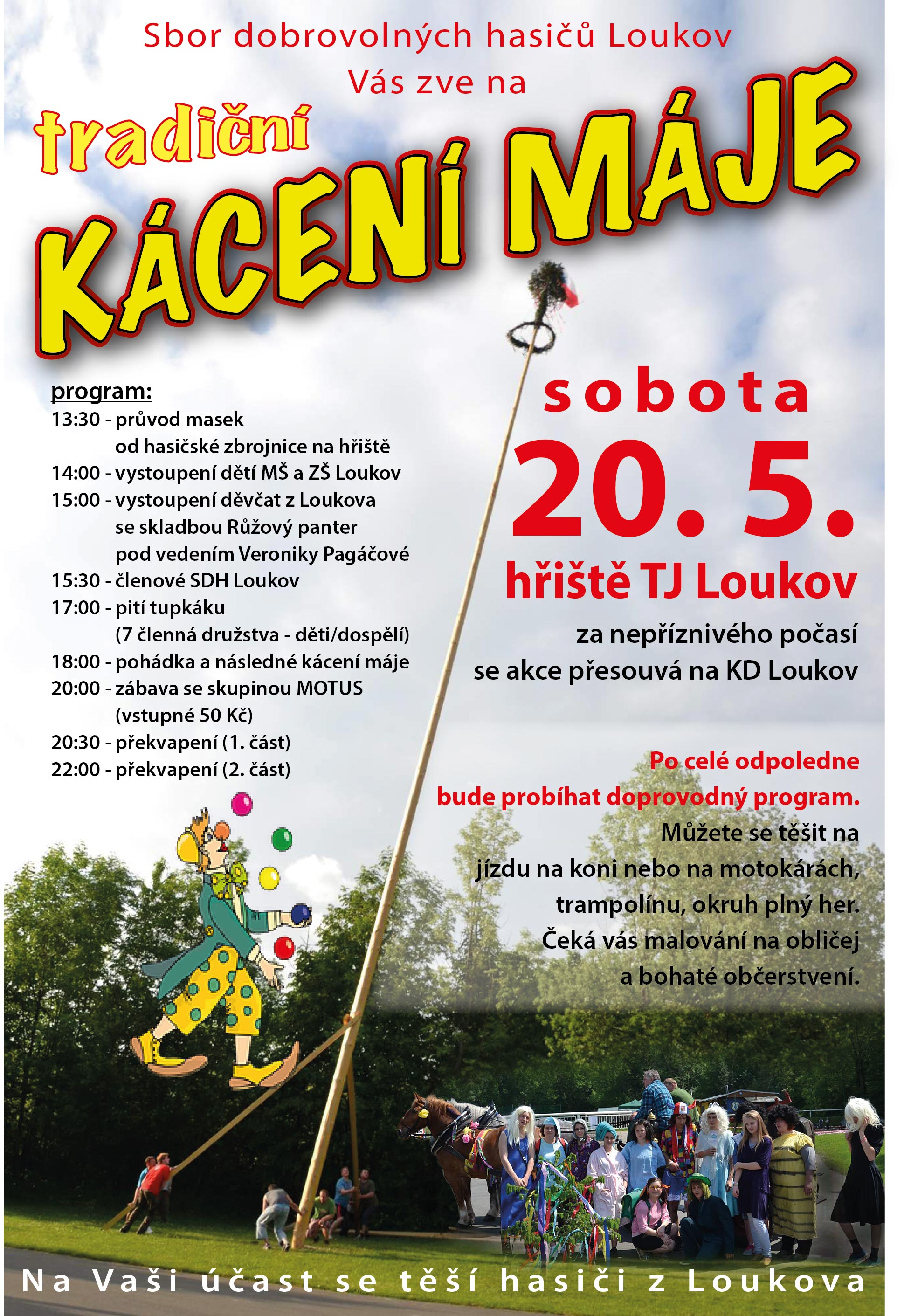Kácení máje je oslavou mládí a jara. Tato tradice je součástí každoroční akce, kterou pořádá sbor dobrovolných hasičů Loukov a letos Vás opět zve na tradiční kácení máje. Akce proběhne 20. května na hřišti v Loukově (za nepříznivého počasí KD). Celá akce začne v 13:30 průvodem masek od hasičské zbrojnice a přes den bude probíhat kolo her pro děti a různá vystoupení. Večer už bude patřit kapele MOTUS a dojde i na velké překvapení. Jídlo a pití bude zajištěno.