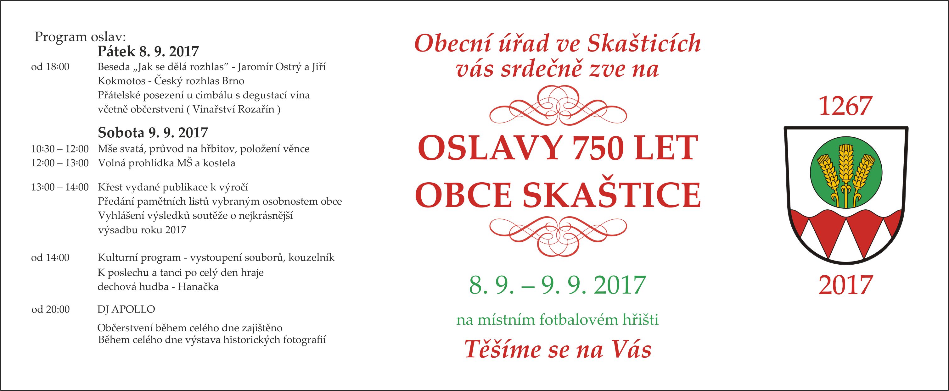 Již tento pátek 8. září a v sobotu 9. září můžete vyrazit na oslavy 750 let obce Skaštice.