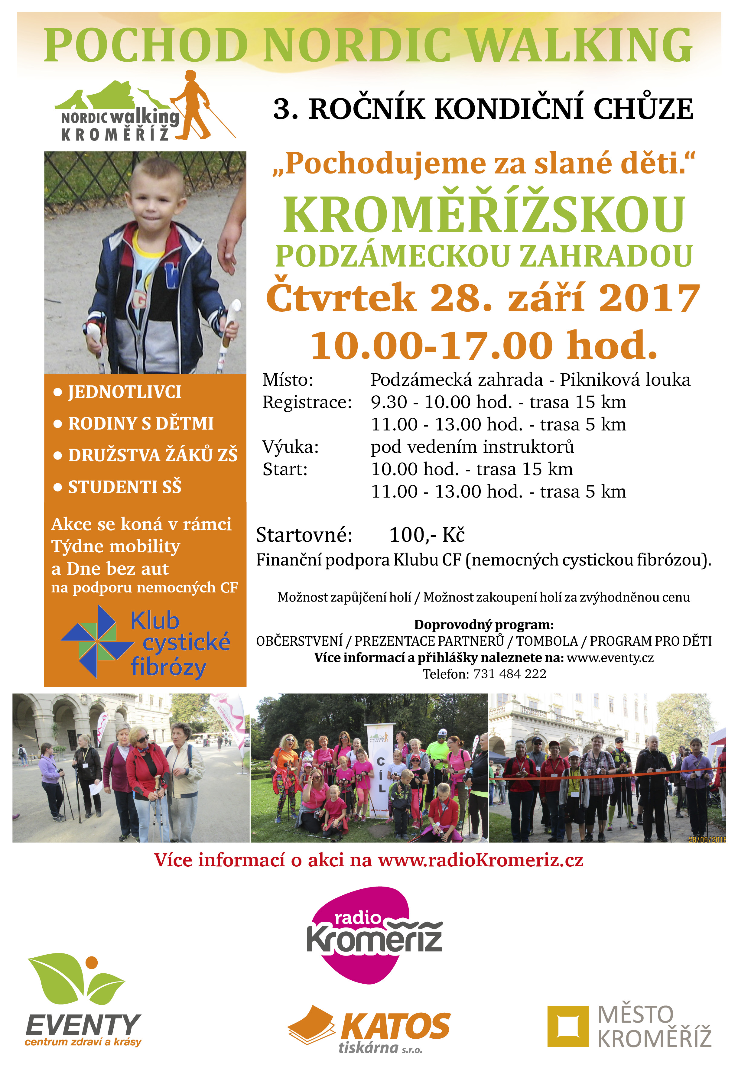 Letos už celkem potřetí máte možnost vyrazit na akci s názvem ,,Pochodujeme za slané děti.". Jedná se o pochod kondiční chůze kroměřížskou Podzámeckou zahradou. Půjde konkrétně o dynamickou chůzi se speciálními holemi, které si bude možné přímo na místě buď zakoupit, nebo zapůjčit. Akce se můžou zúčastnit jak děti, tak rodiny s dětmi, družstva žáků ZŠ nebo studenti SŠ. V rámci doprovodného programu bude připraveno občerstvení, tombola i program pro děti. Startovné bude 100,- Kč a bude využito na finanční podporu Klubu CF (nemocných cystickou fibrózou). Sraz všech účastníků proběhne v Podzámecké zahradě na Piknikové louce ve čtvrtek 28. září.
