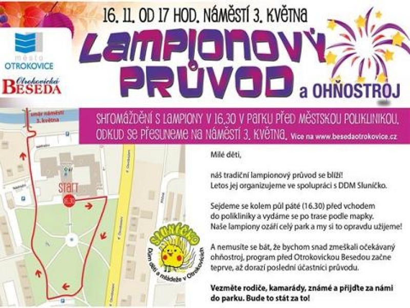 Účastníci s lampiony se shromáždí v 16.30 hod. v parku před Městskou poliklinikou, odkud se společně přesunou na náměstí 3. května. Poté oblohu rozzáří nádherný ohňostroj. Po ohňostroji bude následovat vystoupení kapely RIPTETO v rozšířené sestavě.