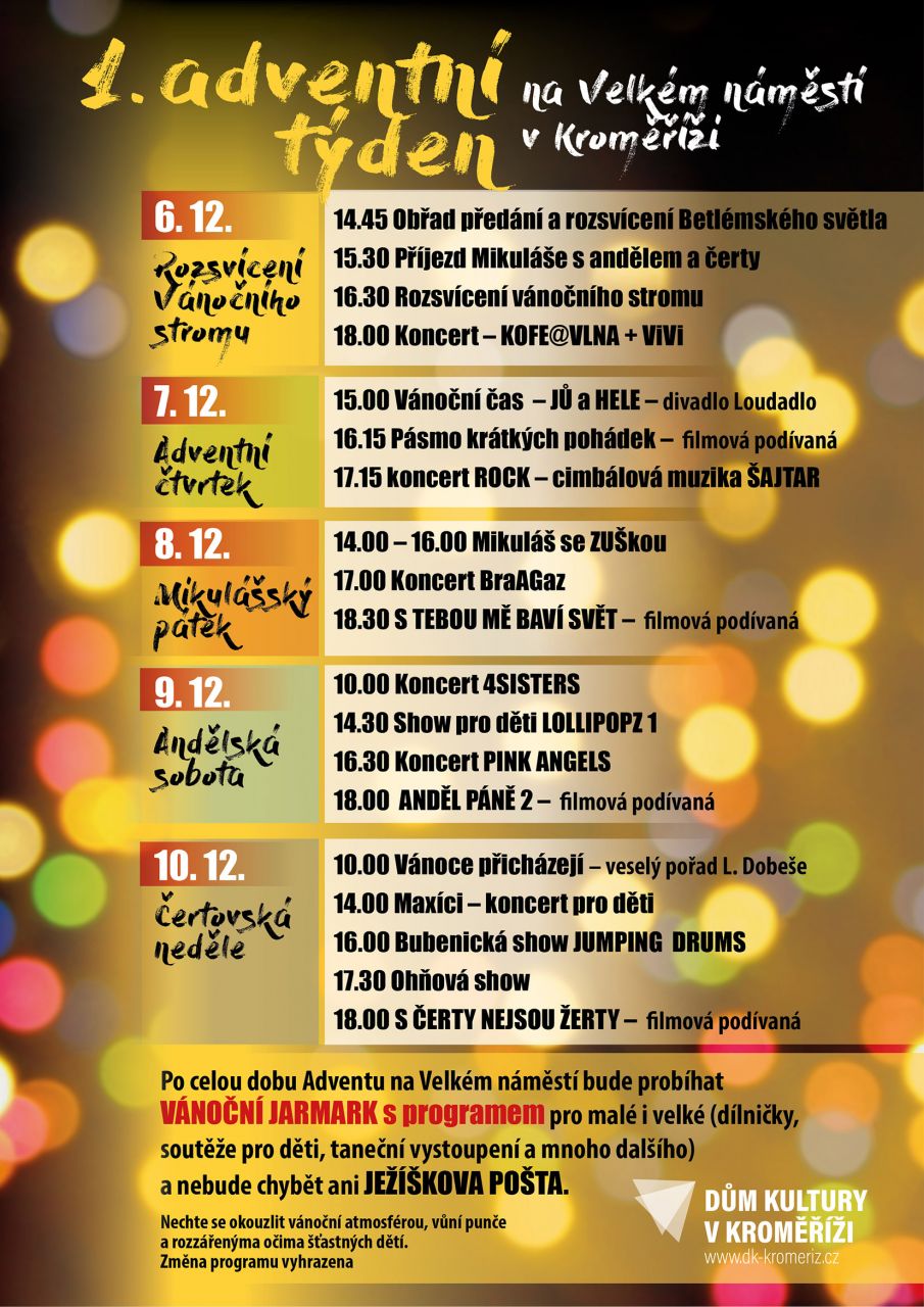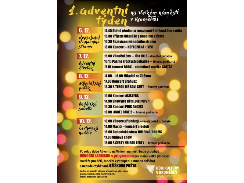 V Kroměříži se 6. prosince slavnostně rozsvítí vánoční strom. Rozsvícení proběhne v 16:30 hodin se starostou města Kroměříže na Velkém náměstí. Ještě předtím se bude na náměstí stavět betlém a dorazí i Mikuláš s andělem a čerty! Slavnostní rozsvícení zakončí koncert KOFE@VLNA + ViVi.