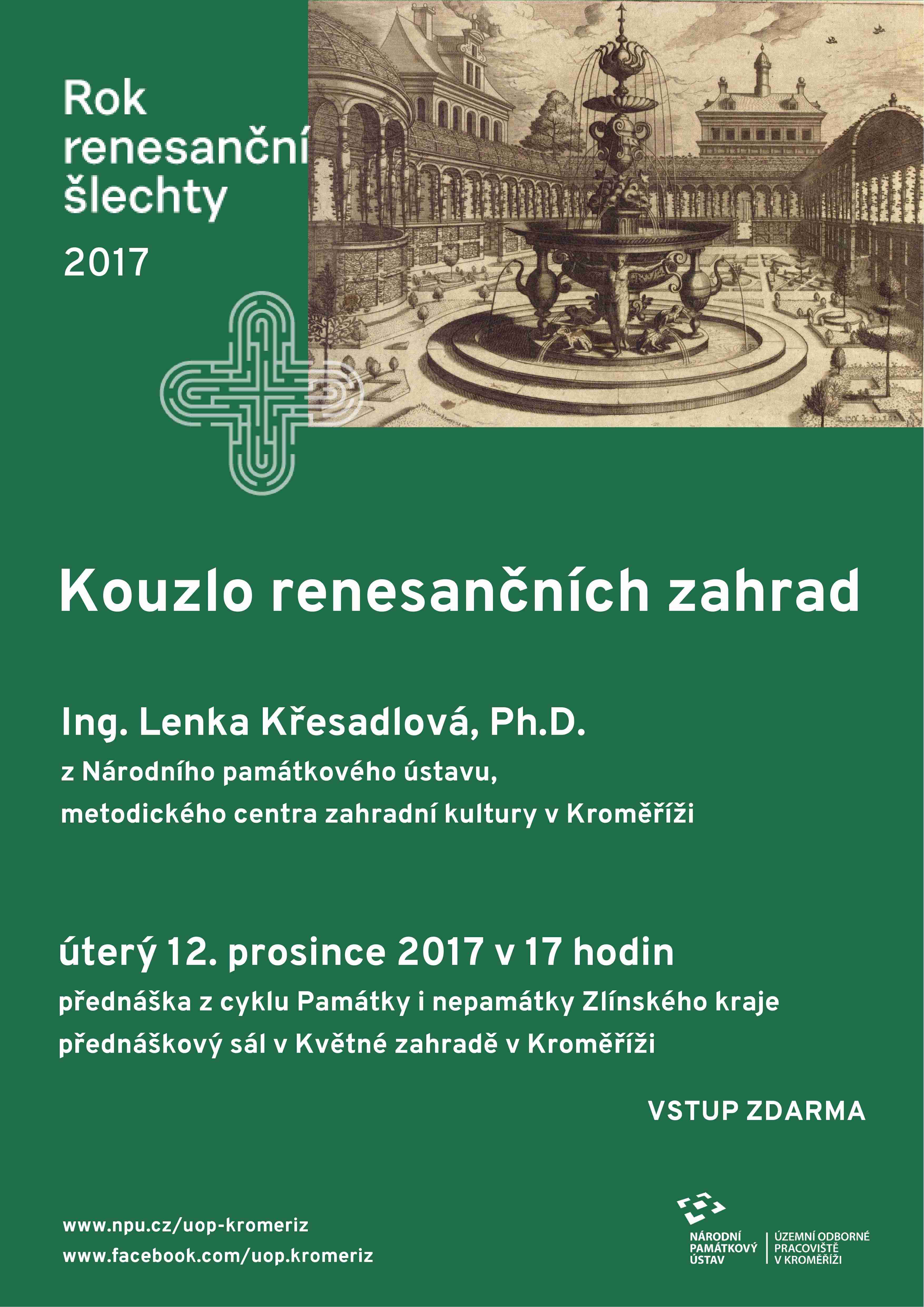 Kroměřížské odborné pracoviště Národního památkového ústavu pravidelně pořádá pro veřejnost přednáškový cyklus. V letošním roce půjde o přednášku s názvem Kouzlo renesančních zahrad. Ta se uskuteční v úterý 12. prosince v 17 hodin v přednáškovém sále Květné zahrady v Kroměříži.