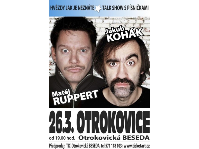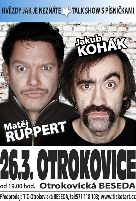 Hvězdy jak je neznáte! Talk show ve které se představí již dnes otrokovickému publiku nedostižný bavič, herec a moderátor Jakub Kohák s frontmanem skupiny Monkey Business Matějem Ruppertem. Svižnou talk show provede moderátor Václav Daniel Kosík. Můžete se těšit nejen na vtipné historky a improvizaci doplněnou o zpěv fenomenálního Matěje Rupperta. Budete se moci také na cokoliv Jakuba Koháka i Matěje Rupperta zeptat. Ale pozor, na své vlastní nebezpečí, protože u těchto pánů není možné nic zaručit! Těšte se na historky z natáčení, ze života a hlavně odpovědi na otázky moderátora Václava Kosíka.