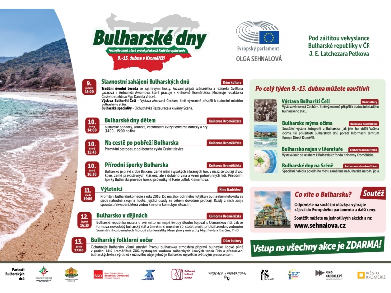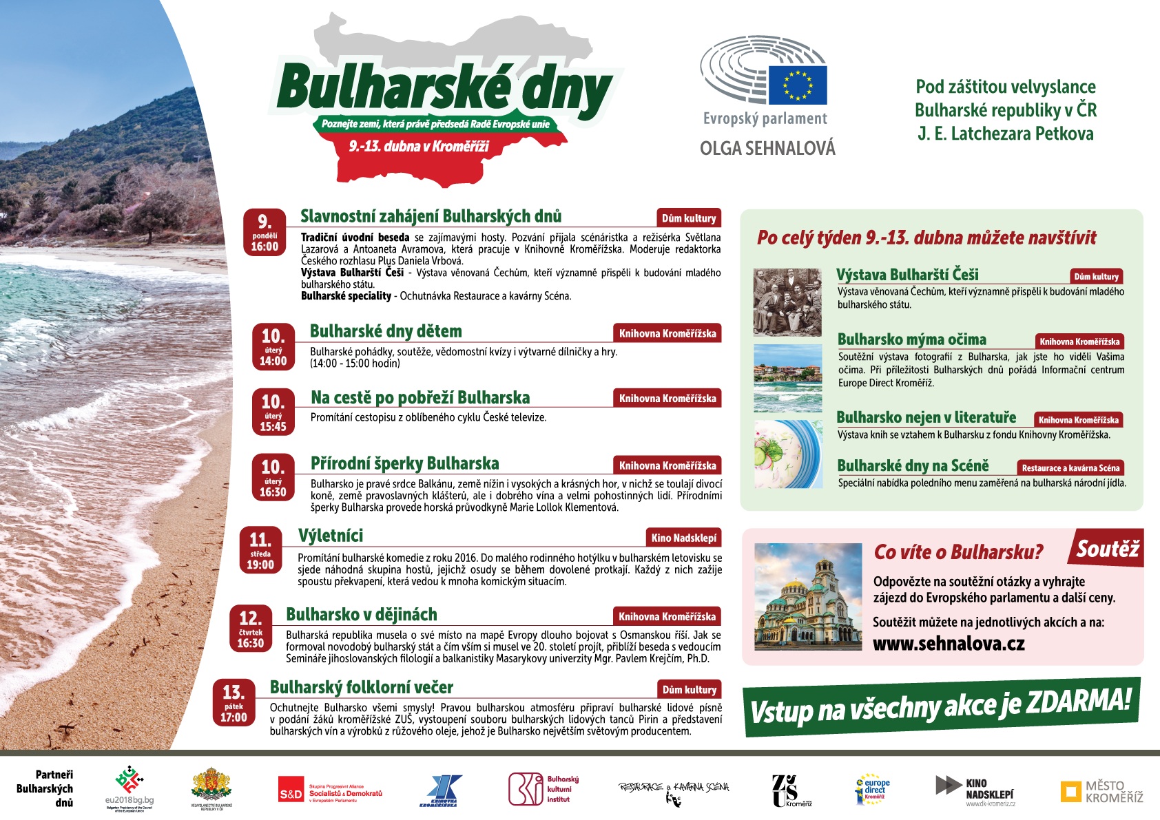 Program zahájí v pondělí 9. dubna v Domu kultury beseda o životě v Bulharsku s režisérkou a scénáristkou Světlanou Lazarovoua a Antoanetou Avramovou, která pracuje v Knihovně Kroměřížska. Slavnostního zahájení se zúčastní i ředitelka Bulharského kulturního institutu v Praze Galina Todorova, která otevře výstavu Bulharští Češi. Výstava připravená Bulharským kulturním institutem je věnovaná osudům našich krajanů, kteří po osvobození Bulharska v roce 1878 přispěl i k budování jejich mladého státu. Mnoho z nich se stalo známými a pro Bulharsko významnými osobnostmi.