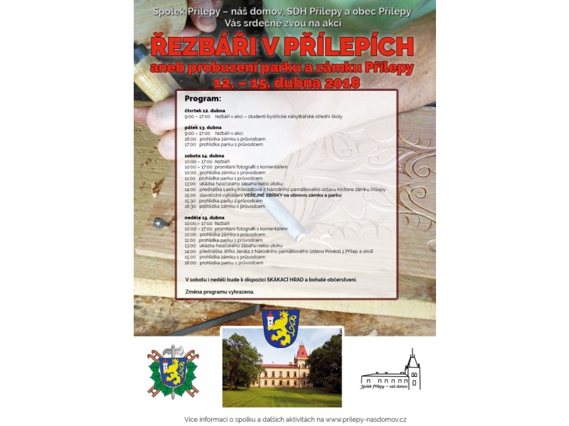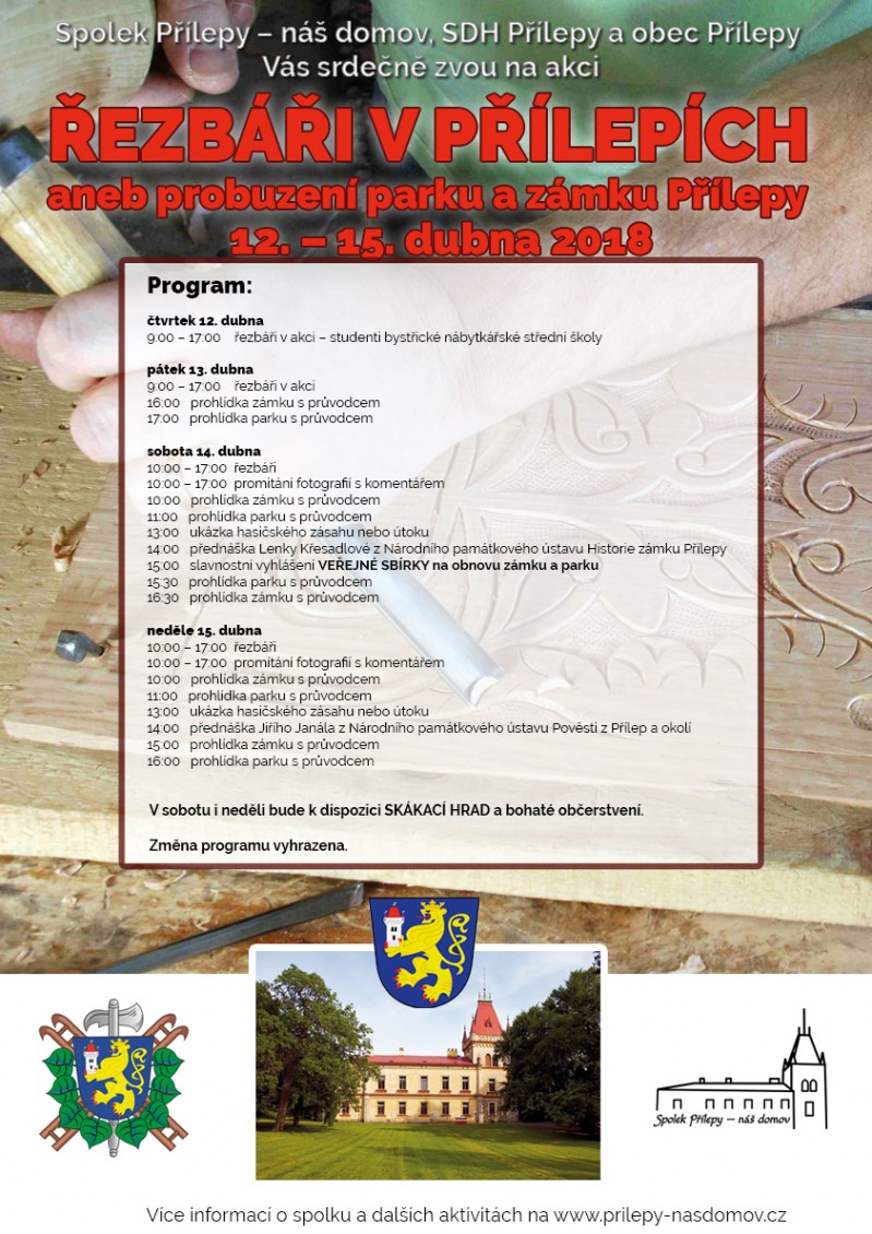 Řezbáři budou probouzet Přílepy od čtvrtka 12. dubna do neděle 15. dubna. Studenti bystřické školy budou po celé čtyři dny vyřezávat z pokácených stromů sochy. Dále budou v parku a zámku probíhat komentované prohlídky, pracovníci Národního památkového ústavu v Kroměříži povedou přednášky na téma historie zámku, parku a okolí Přílepy.