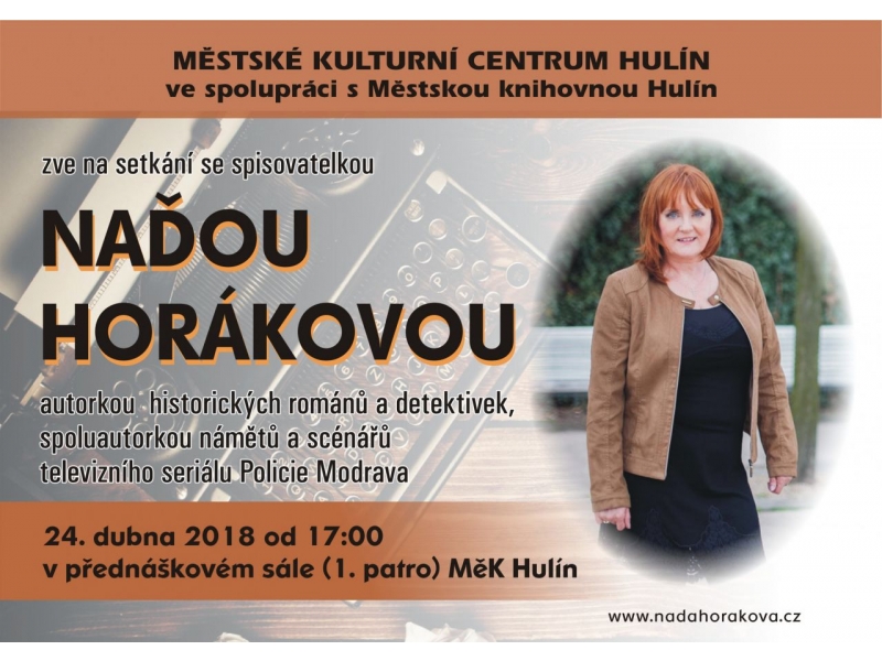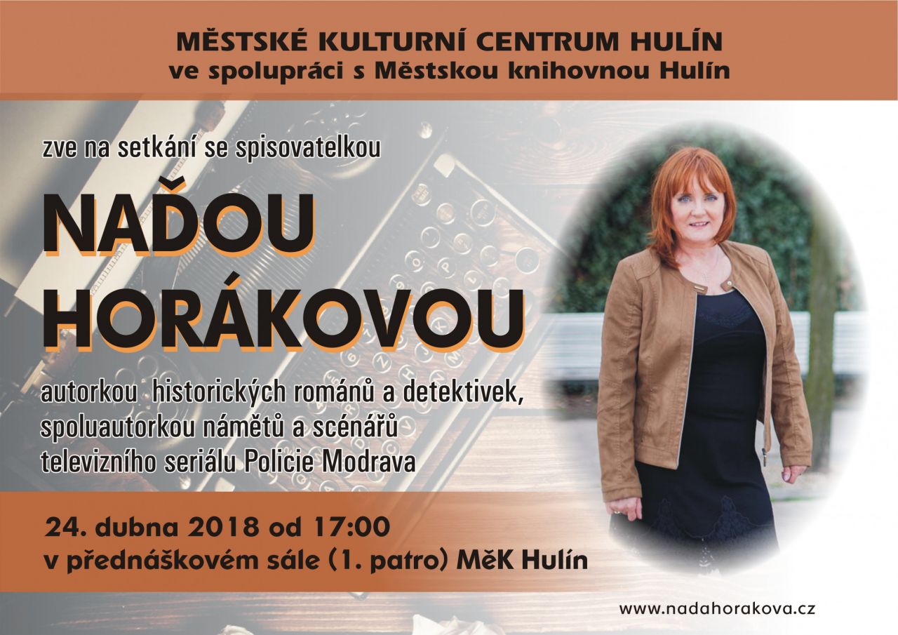 Už v úterý 24. dubna přijede spisovatelka Naďa Horáková do Hulína besedovat se svými čtenáři. Uvítá jí tamější Městské kulturní centrum. Vzhledem k tomu, že Horáková je nejen autorka knih, ale také námětů a scénářů k seriálu Policie Modrava, tak návštěvníky čeká spousta témat, která se budou probírat.