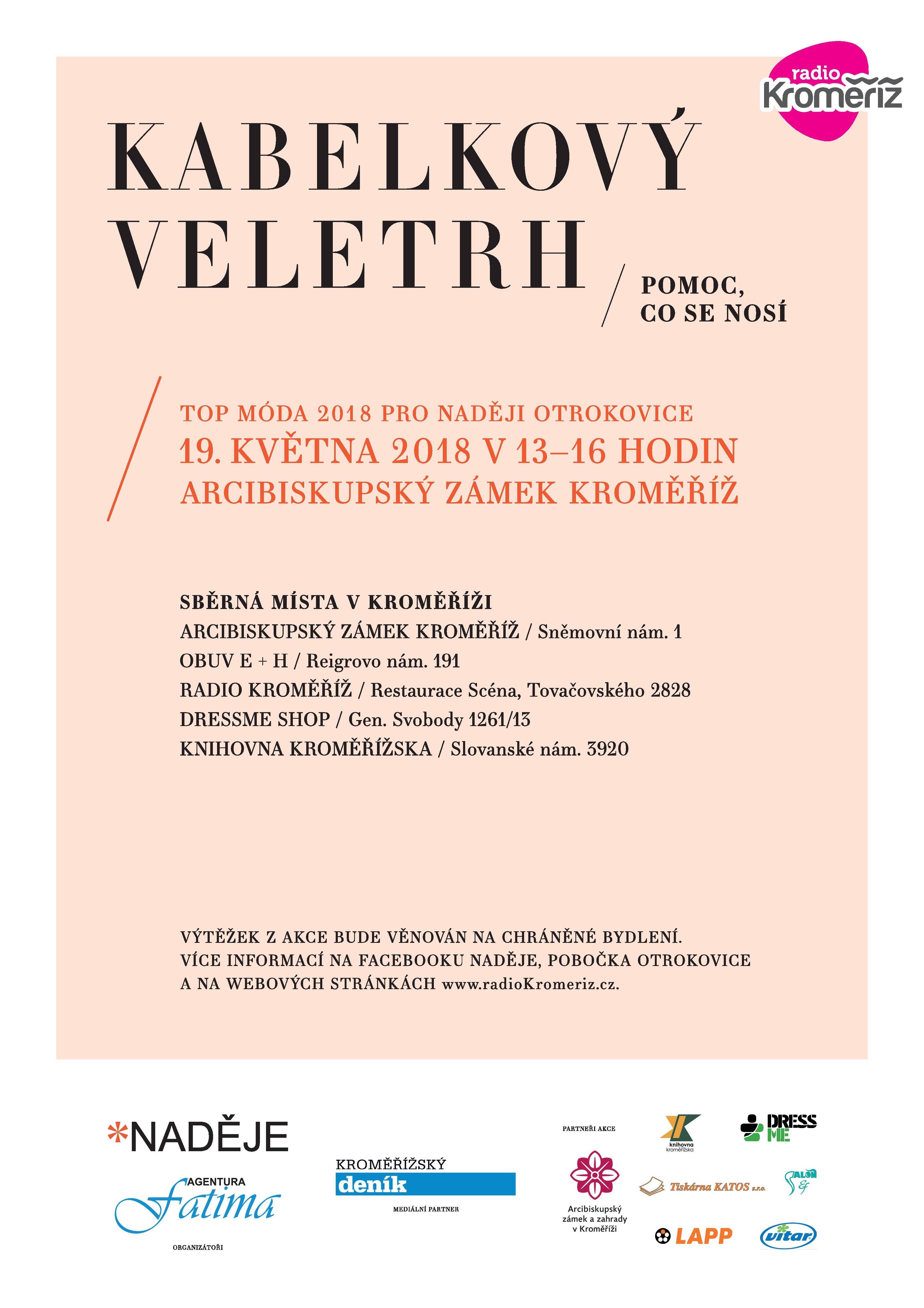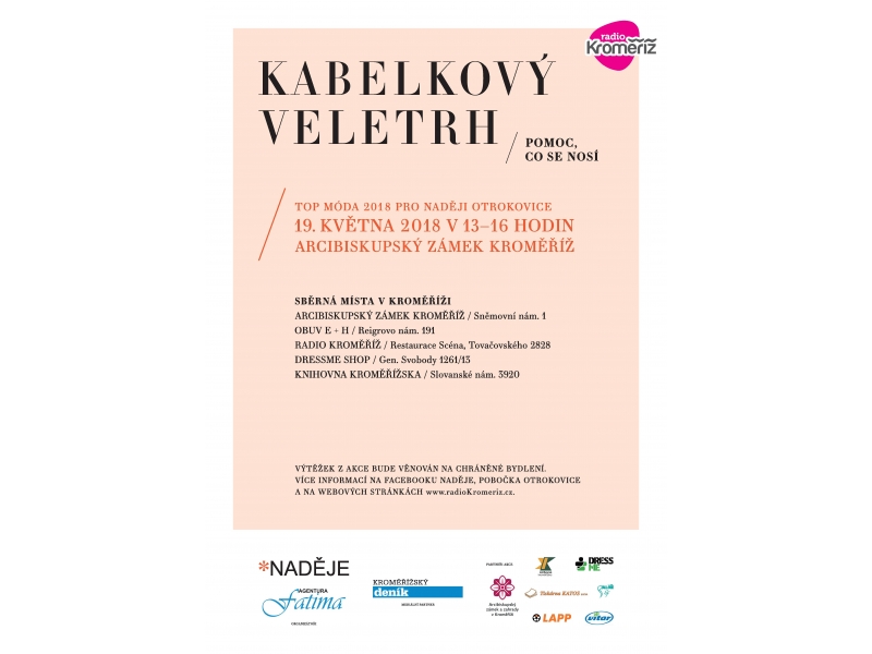 Kabelkový veletrh, na němž se darované kabelky budou prodávat, se bude pořádat odpoledne v sobotu 19. května v rámci módní přehlídky Top móda 2018 na Arcibiskupském zámku v Kroměříži. Když tam mezi 13 a 16 hodinou nakoupíte některou z darovaných kabelek, tak tím potěšíte nejen sebe, ale také někoho jiného. Výtěžek totiž bude věnován na chráněné bydlení. Ať už se rozhodnete darovat kousek ze své skříně nebo si budete chtít nějaký pořídit, tak v obou případech tím uděláte dobrý skutek!