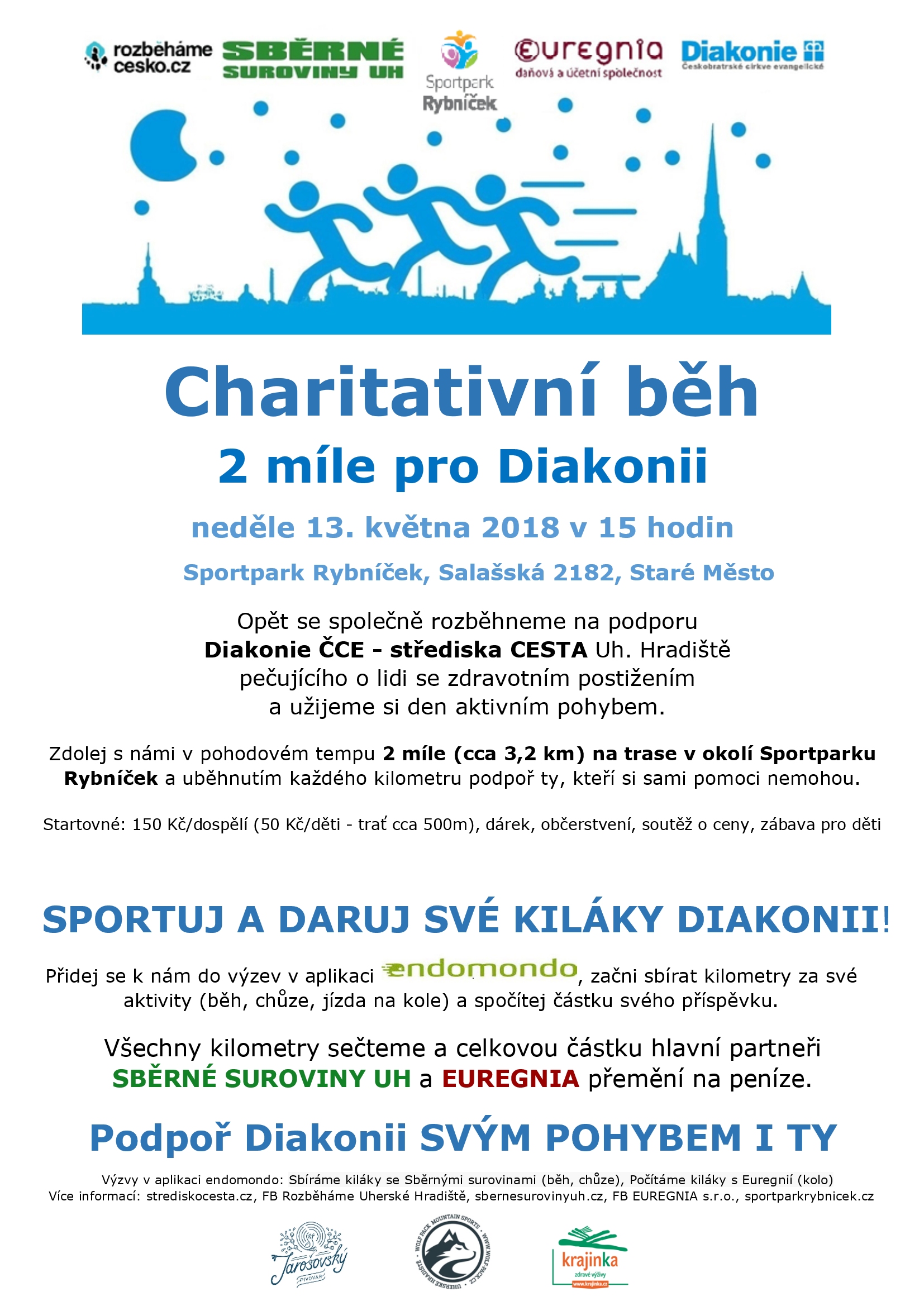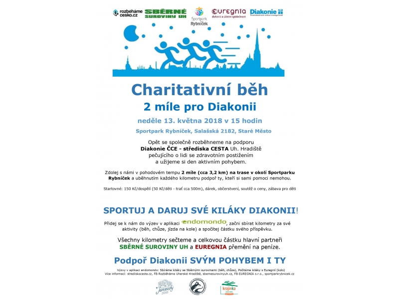 Tuto neděli 13. května proběhnou ve Starém Městě u Uherského Hradiště dvě propojené akce. V rámci Dne Pohybu pro zdrav se představí různé sportovní spolky a proběhne doprovodný program za účelem propagace zdravotního životního stylu mezi dětmi. S tím souvisí pořádání Benefičního běhu 2 míle pro Diakonii, který má, jako již tradičně, podpořit sociální služby Diakonie ČCE – středisko Cesta Uherské Hradiště. Akce probíhá v tamějším Sportparku Rybníček.