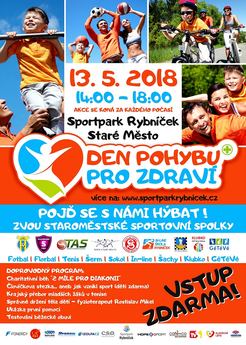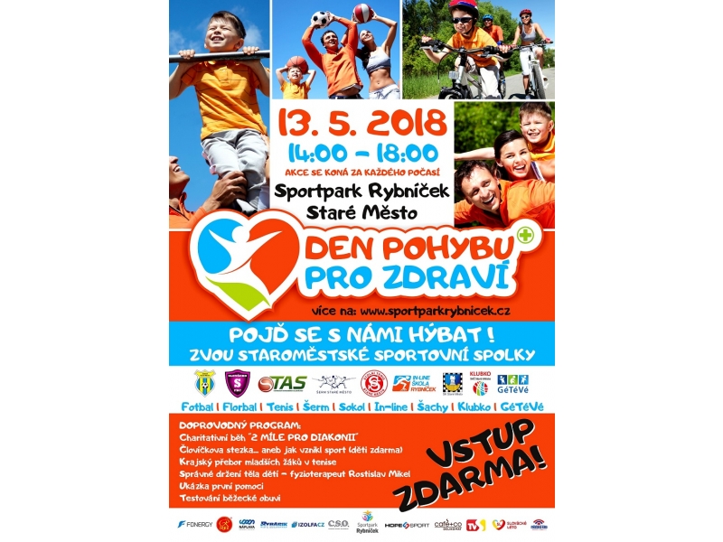 Den Pohybu pro zdraví se koná od 14 do 18 hodin ve Sportparku Rybníček. Představí se na něm různé sportovní spolky, od florbalisty přes sokolníky a šermíře až po šachisty. Na účastníky čeká také doprovodný program v podobě ukázky první pomoci, testování běžecké obuvi nebo přednáška o správném držení těla od fyzioterapeuta Rostislava Mikela. Budete moci zhlédnout krajský přebor mladších žáků v tenise a také si poslechnete, jak vůbec vznikl sport.