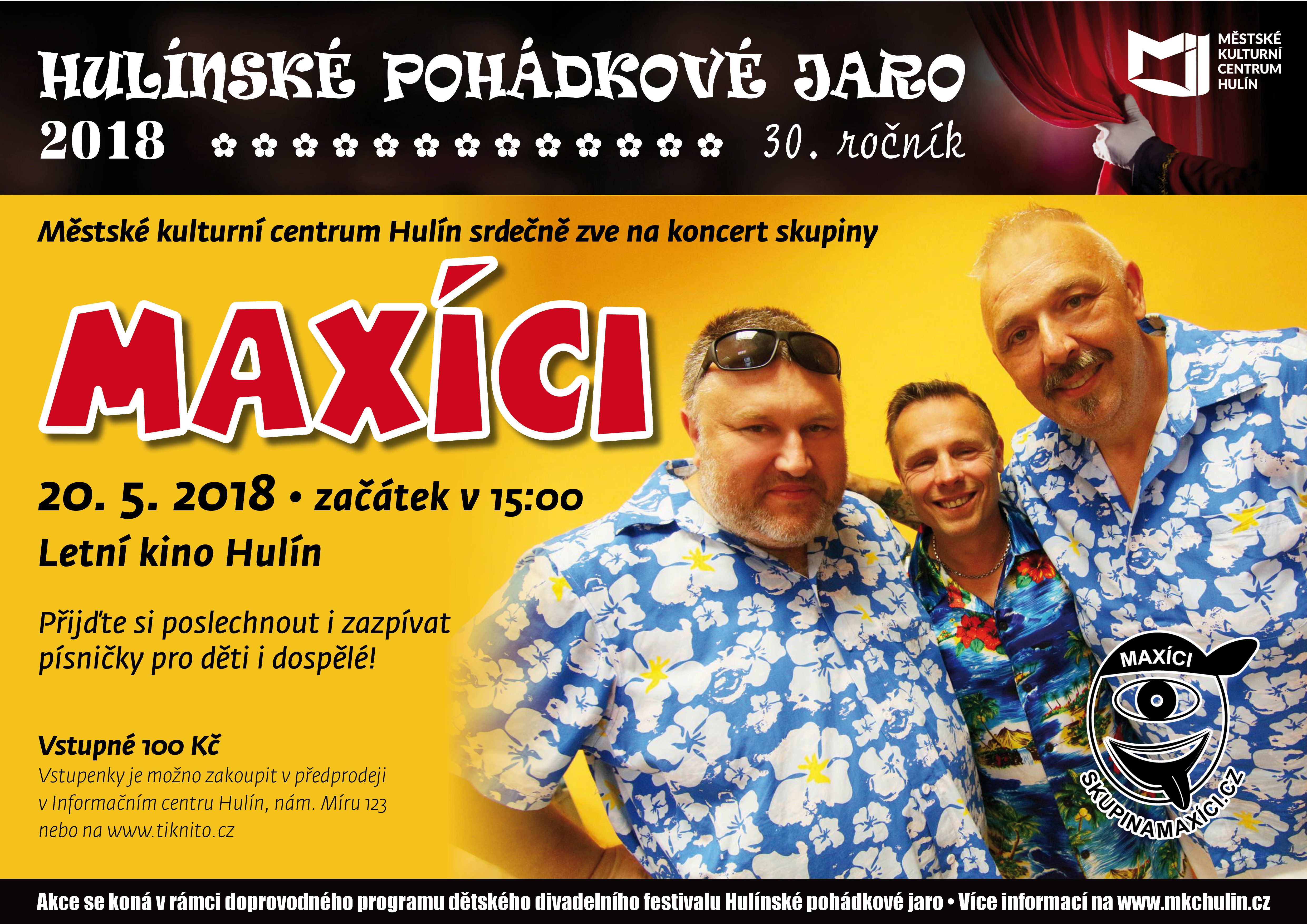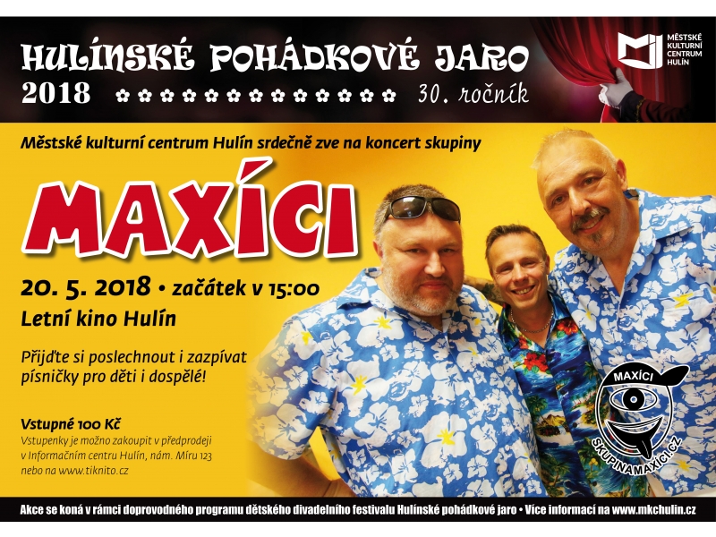 Koncert skupiny Maxíci se koná v rámci dětského divadelního festivalu Hulínské pohádkové jaro. Maxíci vystoupí v Letním kině v Hulíně, a to v neděli 20. května od 15:00. Předprodej vstupenek je v Informačním centru Hulín a na