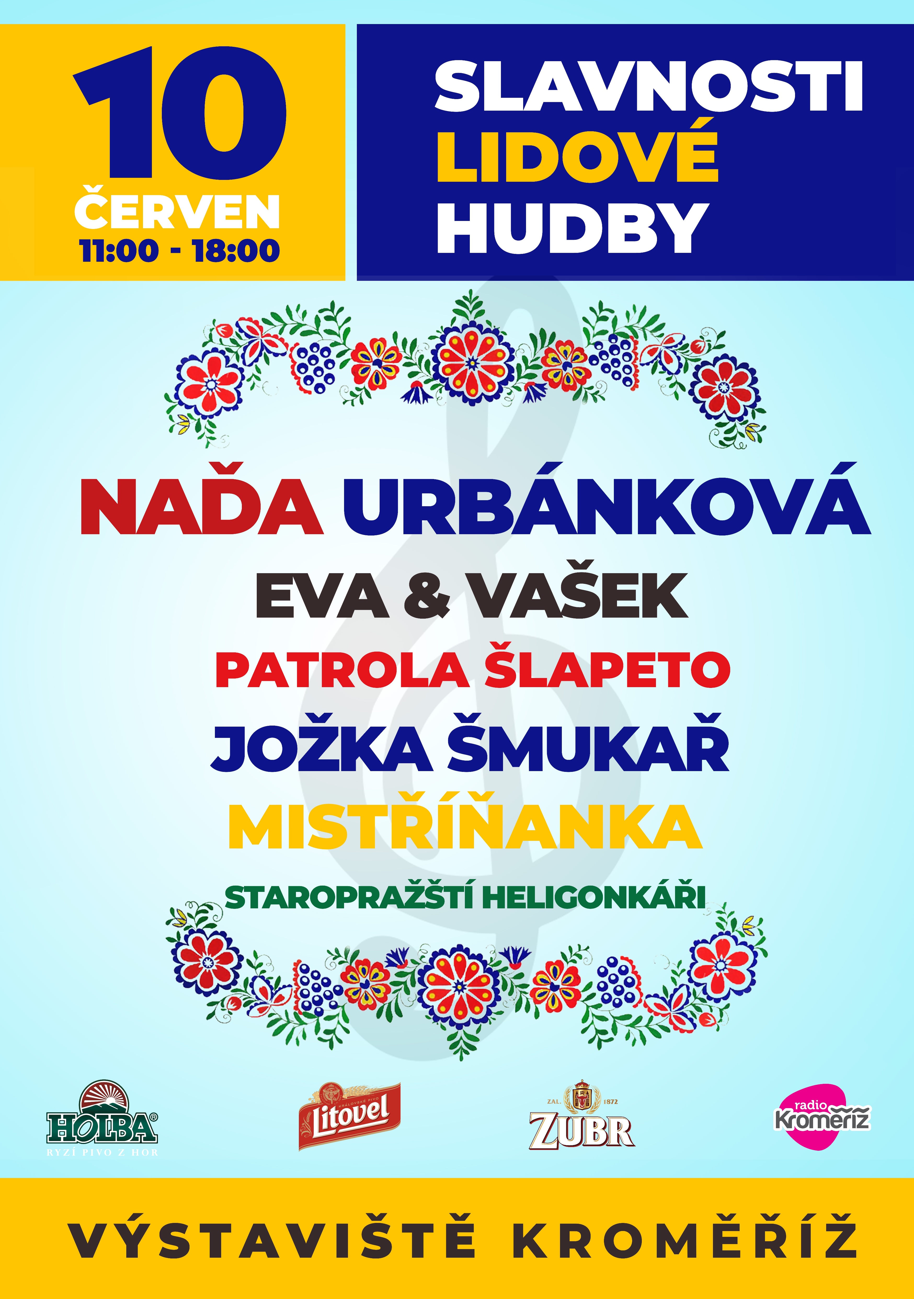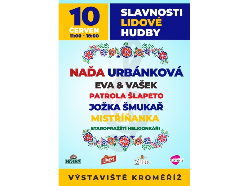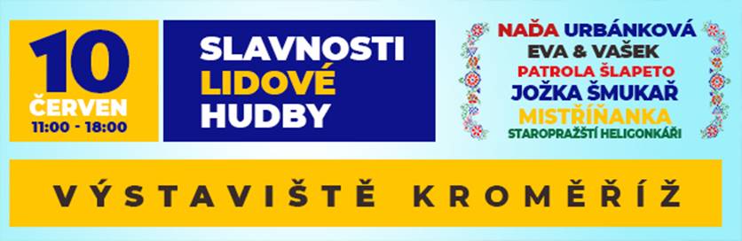 Výstaviště Kroměříž zve na jedinečné Slavnosti lidové hudby, které proběhnou v neděli 10. června v krásném prostředí kroměřížského výstaviště. Přijďte si poslechnout a společně zapívat písničky od Evy a Vaška, Mistříňanky, Staropražských heligonkářů, Jožky Šmukaře s cimbálovou kapelou, Patroly Šlapeto a Nadi Urbánkové.