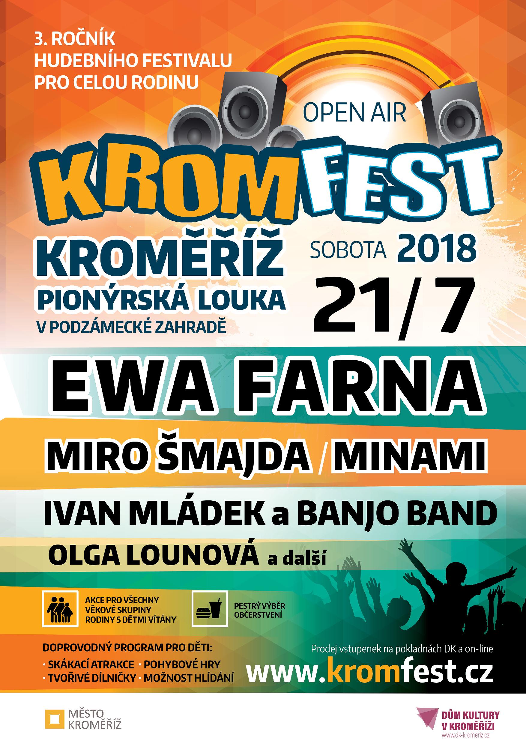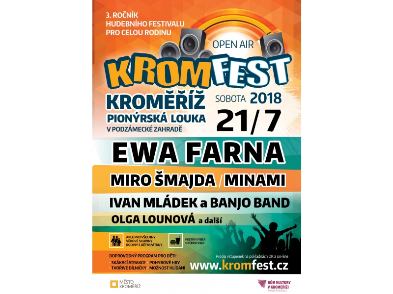 Po dvou úspěšných ročnících pohodového letního festivalu Kromfest přichází další! Ten se, jako již tradičně, uskuteční na Pionýrské louce u Podzámecké zahrady v Kroměříži. A i letošní Kromfest je koncipován jako hudební zábava pro celou rodinu, kde si na své přijdou všechny věkové kategorie. Nezapomeňte si proto koupit lístky a do kalendářů si poznačit sobotu 21. července!