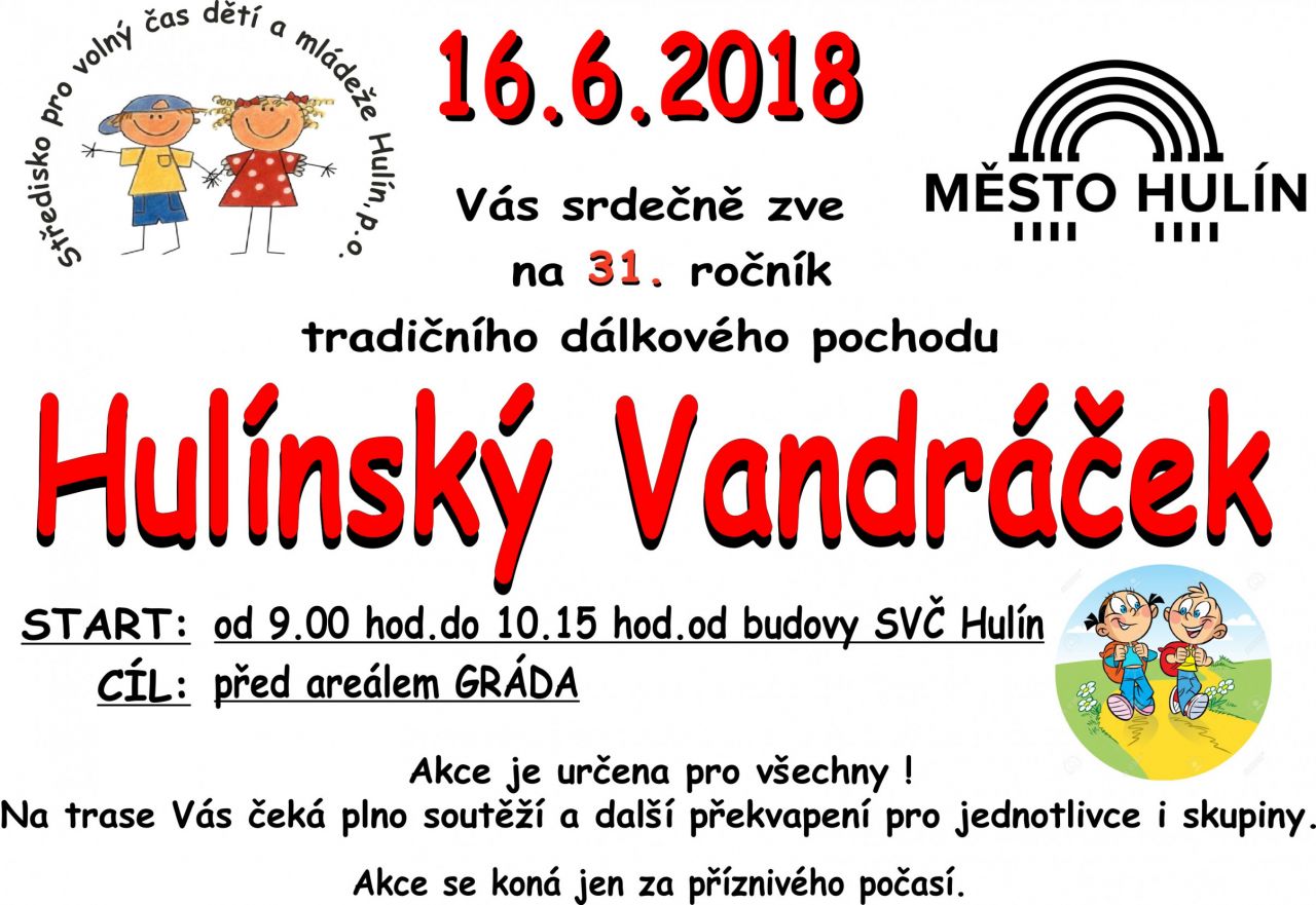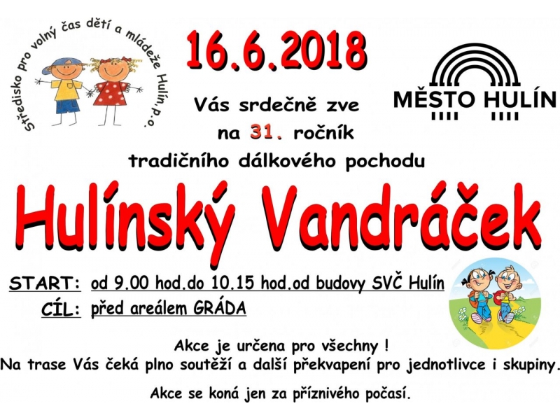 Středisko pro volný čas dětí a mládeže Hulín pořádá v sobotu 16. června 2018 tradiční dálkový pochod Hulínský vandráček. Start pochodu je v 9:00 hodin a probíhá do 10:15 hodin u budovy Střediska volného času a cílem je areál Grádo. Na trase Vás čeká plno soutěží. V areálu Gráda je připraveno rybaření pro všechny. Kdo má rybářský prut. tak ten si ho může vzít s sebou. Pozor! Vandráček se koná jen za příznivého počasí.