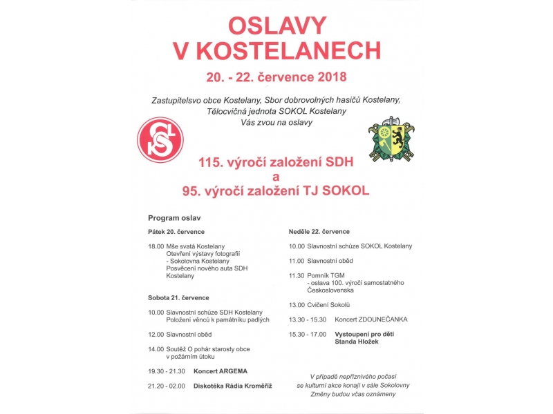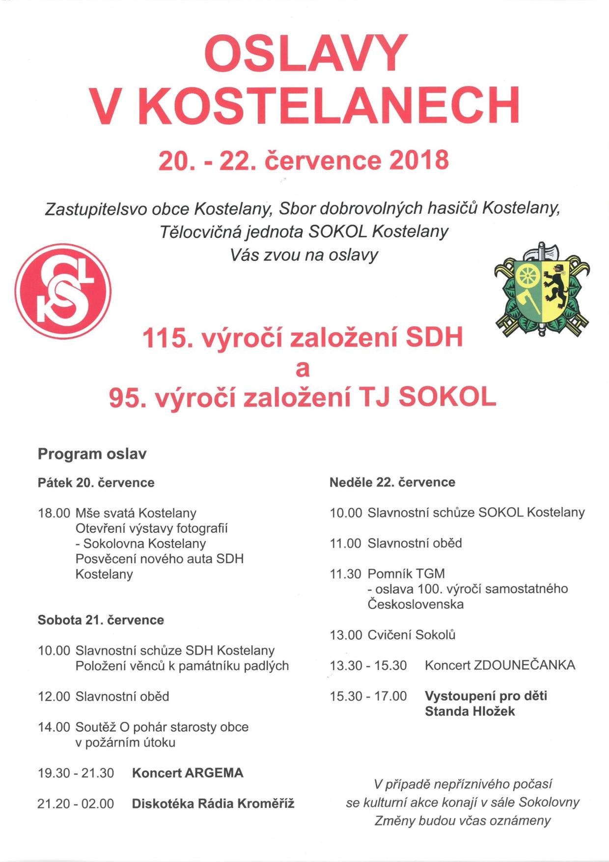 Neděle 22. července bude začínat slavnostní schůzí TJ Sokol Kostelany a po slavnostním obědě se u pomníku T. G. Masaryka připomene 100. výročí vzniku Československa. Ve 13:00 se můžete těšit na cvičení Sokolů po kterém se bude konat koncert Zdounečanky. Den uzavře vystoupení Stanislava Hložka pro děti.