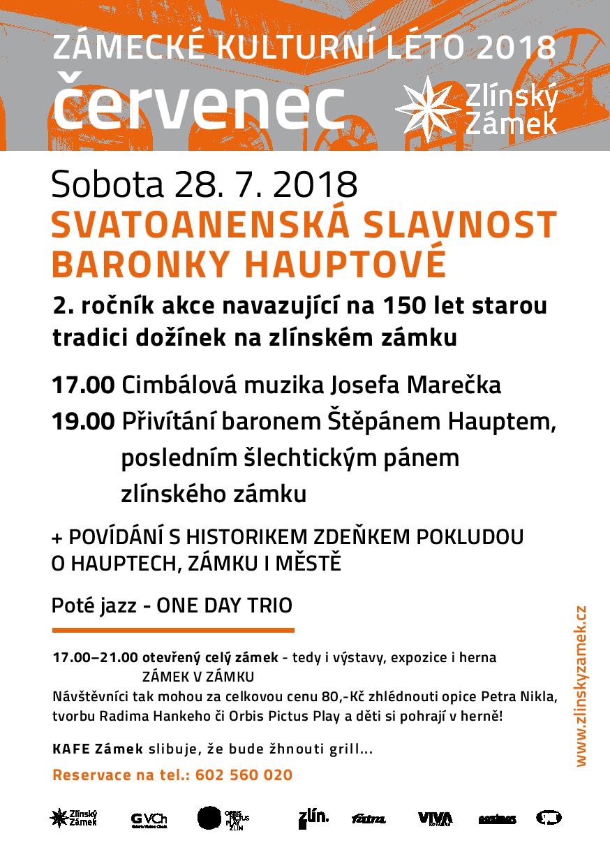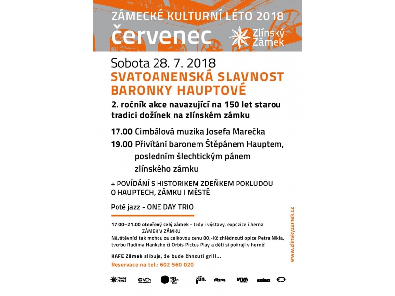 Na tradici dožínek a dalších letních slavností na zlínském zámku navazuje Svatoanenská slavnost baronky Hauptové. Její druhý ročník se uskuteční v sobotu 28. července od 17:00 hodin. Návštěvníci se mohou těšit na cimbálovou a jazzovou hudbu, vyprávění s historikem Zdeňkem Pokludou a otevřené expozice Galerie Václava Chada. Akce je součástí Zámeckého kulturního léta.
