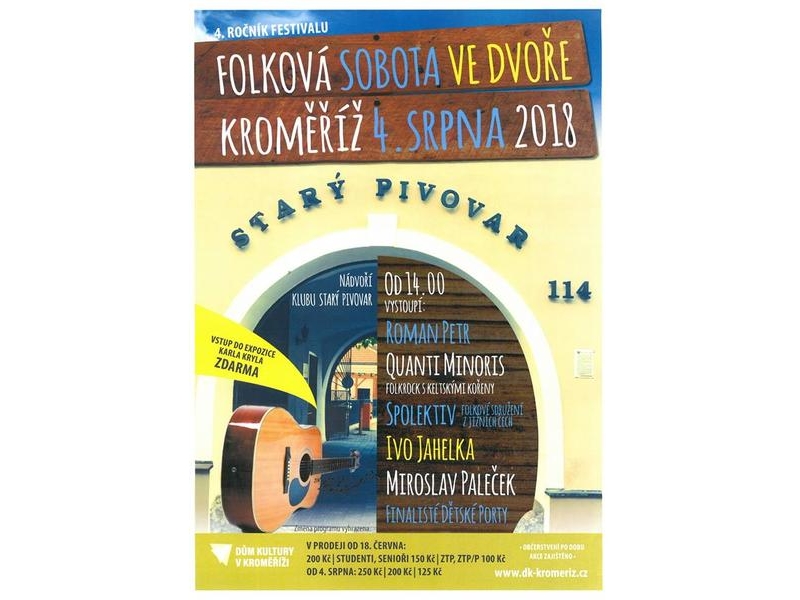 Pohodové hudební setkávání folkových a žánrově příbuzných muzikantů v příjemném prostředí nádvoří radnice a Starého pivovaru v Kroměříži si za čtyři roky existence vydobylo přízeň náročného kroměřížského publika, a tak jednodenní festival Folková sobota ve dvoře, kterou pořádá Dům kultury v Kroměříži, nebude chybět ani letos.