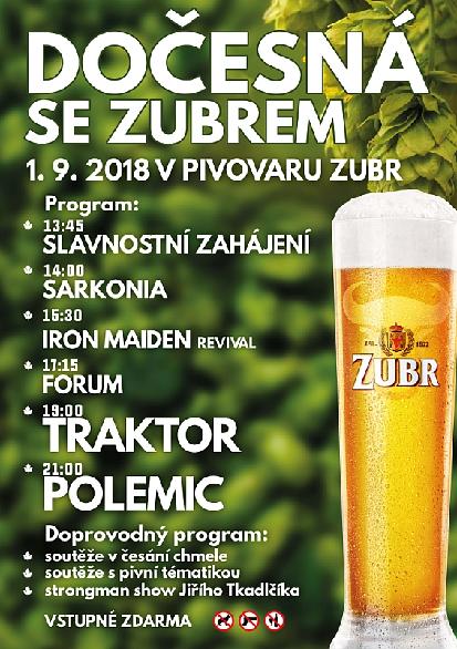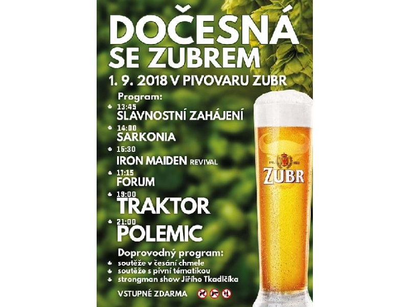 Sobota 1. září se v pivovaru Zubr ponese v duchu oslav chmelového moku i samotného chmele, jako základní suroviny, která se při výrobě piva používá. Akce Dočesná se Zubrem nabídne bohatý hudební program v čele s kapelami Traktor a Polemic, soutěže v česání chmele i s pivní tématikou, strongman show Jiřího Tkadlčíka a především pivo se zubří hlavou ve znaku.