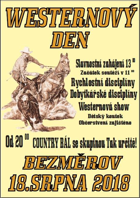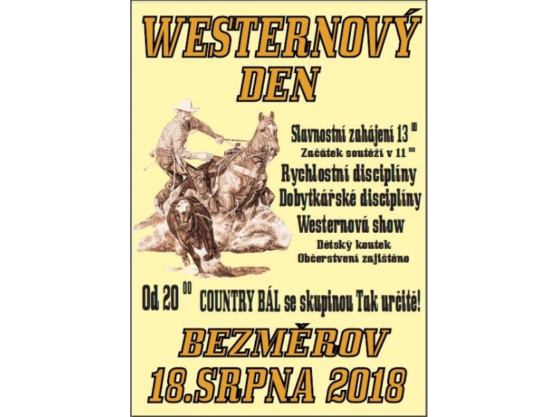 Westernový den v Bezměrově bude slavnostně zahájen v sobotu 18. srpna ve 13:00 hodin, ale již v 11 hodin se můžete bavit soutěžemi, které pro vás budou připraveny. Během odpoledne bude na programu rychlostní a dobytkářské disciplíny a také westernová show.