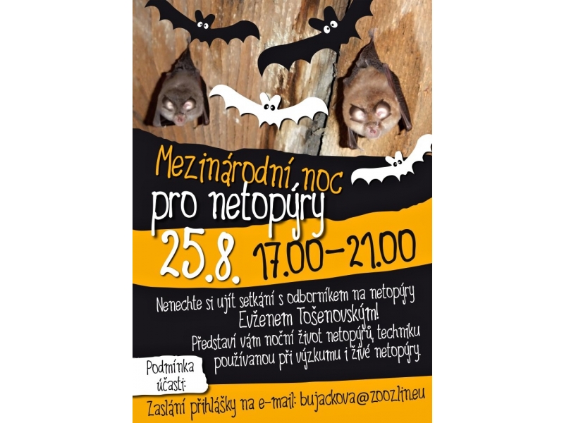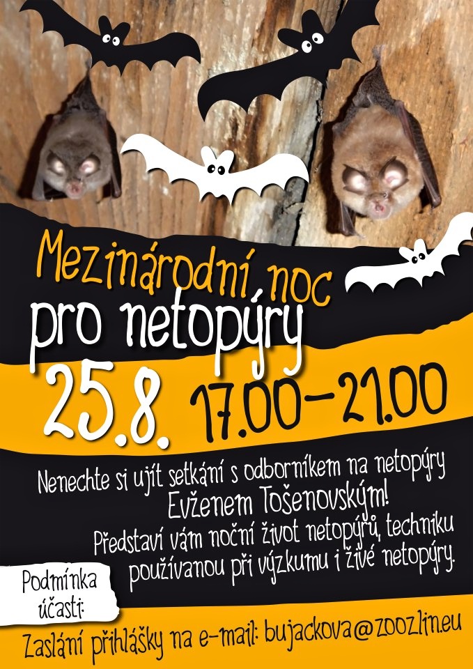 Nenechte si 25. srpna (od 17:00 do 21:00 hod.) ujít přednášku našeho předního odborníka na netopýry Evžena Tošenovského z České společnosti ornitologické. Během krátké vycházky areálem zoo Vám pan Tošenovský představí nejen fascinující noční život netopýrů, ale i moderní techniku používanou při výzkumu (batdetektory, noktovize apod.). Tu si navíc budete moci sami vyzkoušet. Čeká na Vás i setkání s živými, trvale handicapovanými netopýry ze záchranné stanice.
