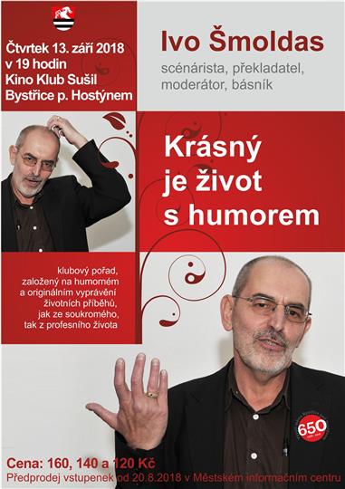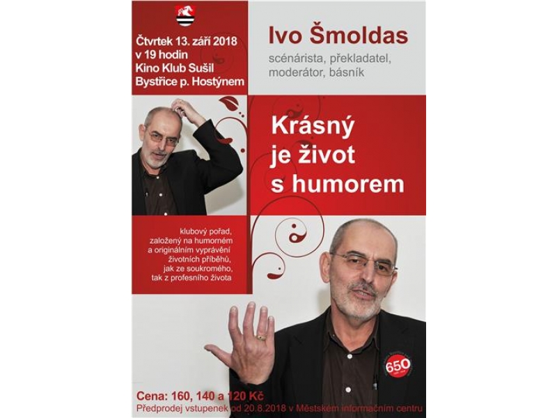 Známý moderátor, překladatel, básník a scénárista Ivo Šmoldas vystoupí ve čtvrtek 13. září v Kino Klubu Sušil v Bystřici pod Hostýnem. Ten vám bude na svém vystoupení vyprávět své humorné a originální příběhy ze soukromého i profesního života.
