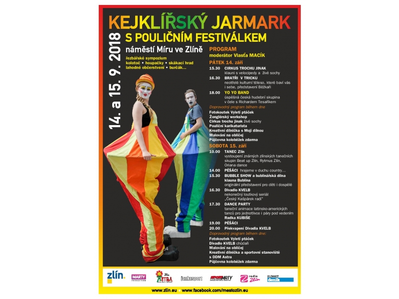 Kejklířský jarmark, který je pravidelnou akcí na náměstí Míru, se uskuteční od pátku 14. září do soboty 15. září na náměstí Míru ve Zlíně. Prodejci nabídnou tradiční řemeslné výrobky, lahodné občerstvení, burčák a mnoho dalšího.
