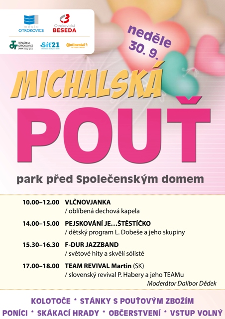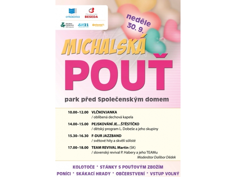 Michalská pouť, která se v Otrokovicích koná tradičně poslední zářijovou neděli, nabídne i letos pestrou zábavu. V neděli 30. září zahraje v parku před Společenským domem v Otrokovicích slovenský TEAM revival a další kvalitní kapely. Po celý den je připraven bohatý program.