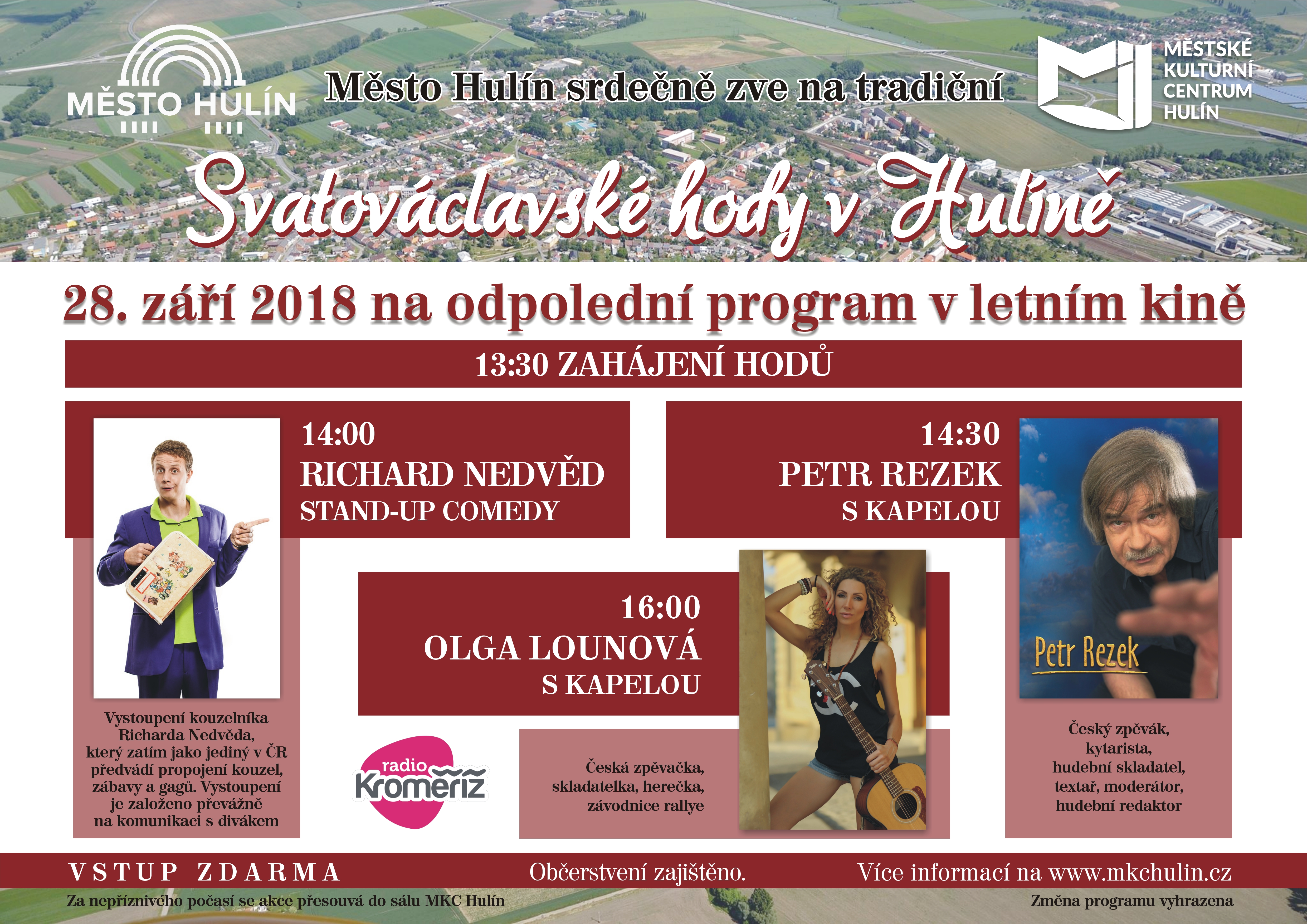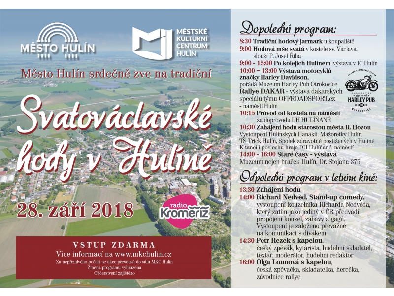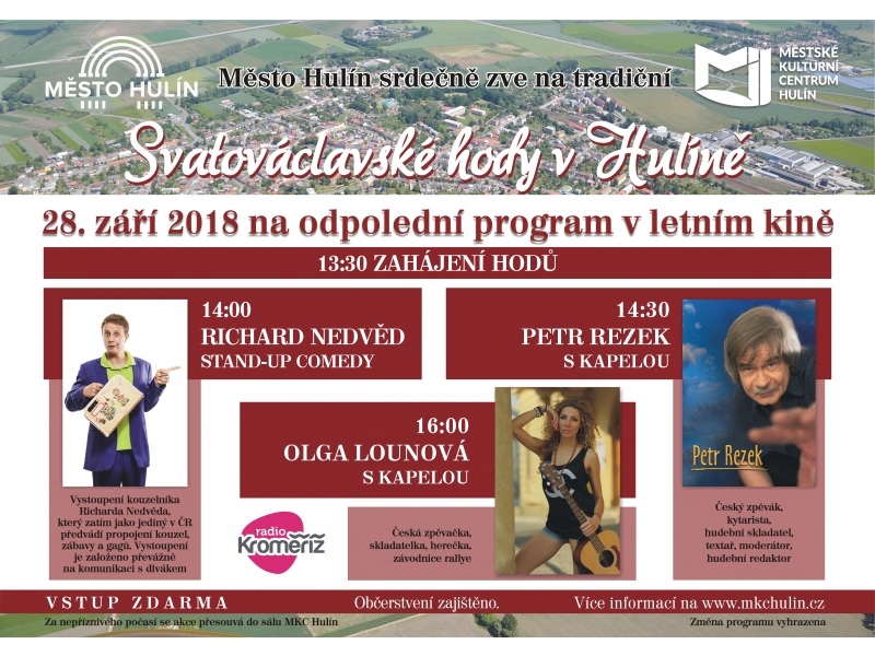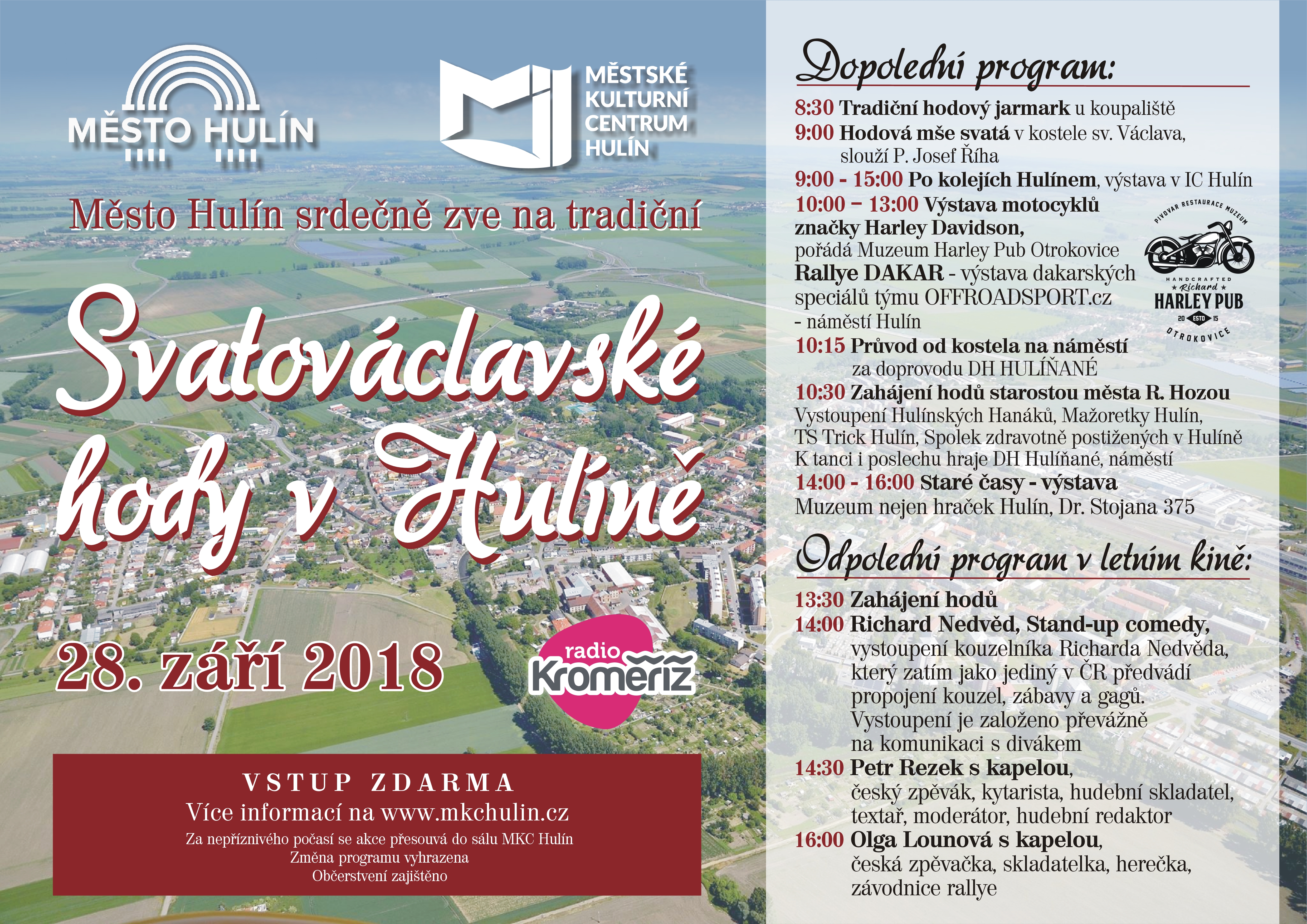 Město Hulín vás srdečně zve na tradiční Svatováclavské hody v Hulíně! Čeká vás sváteční den nabitý zábavným programem. Vše odstartuje dopolední hodová zábava nebo výstava motocyklů a přelije se do odpoledních vystoupení kouzelníka Richarda Nedvěda, hudebníka Petra Rezka a zpěvačka Olgy Lounové. Rozhodně si tuto akci nenechte ujít! Radio Kroměříž je mediální, partnerem akce.