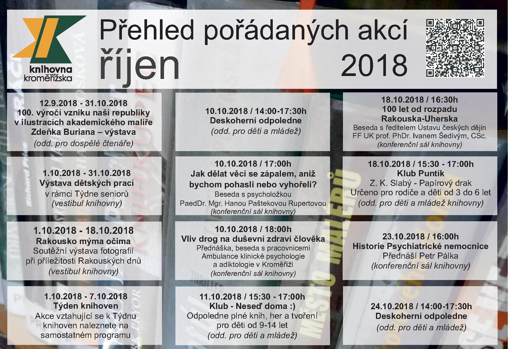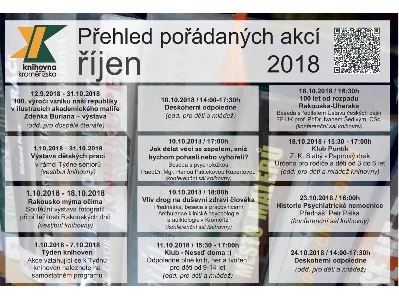 Výčet akcí, co tento měsíc nabízí Knihovna Kroměřížska, je opravdu dlouhý. Kromě výše zmíněného zde budou také aktivity pro dětské čtenáře, např. deskoherní odpoledne nebo výstava dětských prací pořádaná v rámci Týdne seniorů. Prohlédnout kompletní výčet akcí si můžete zde: