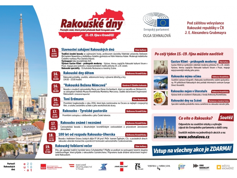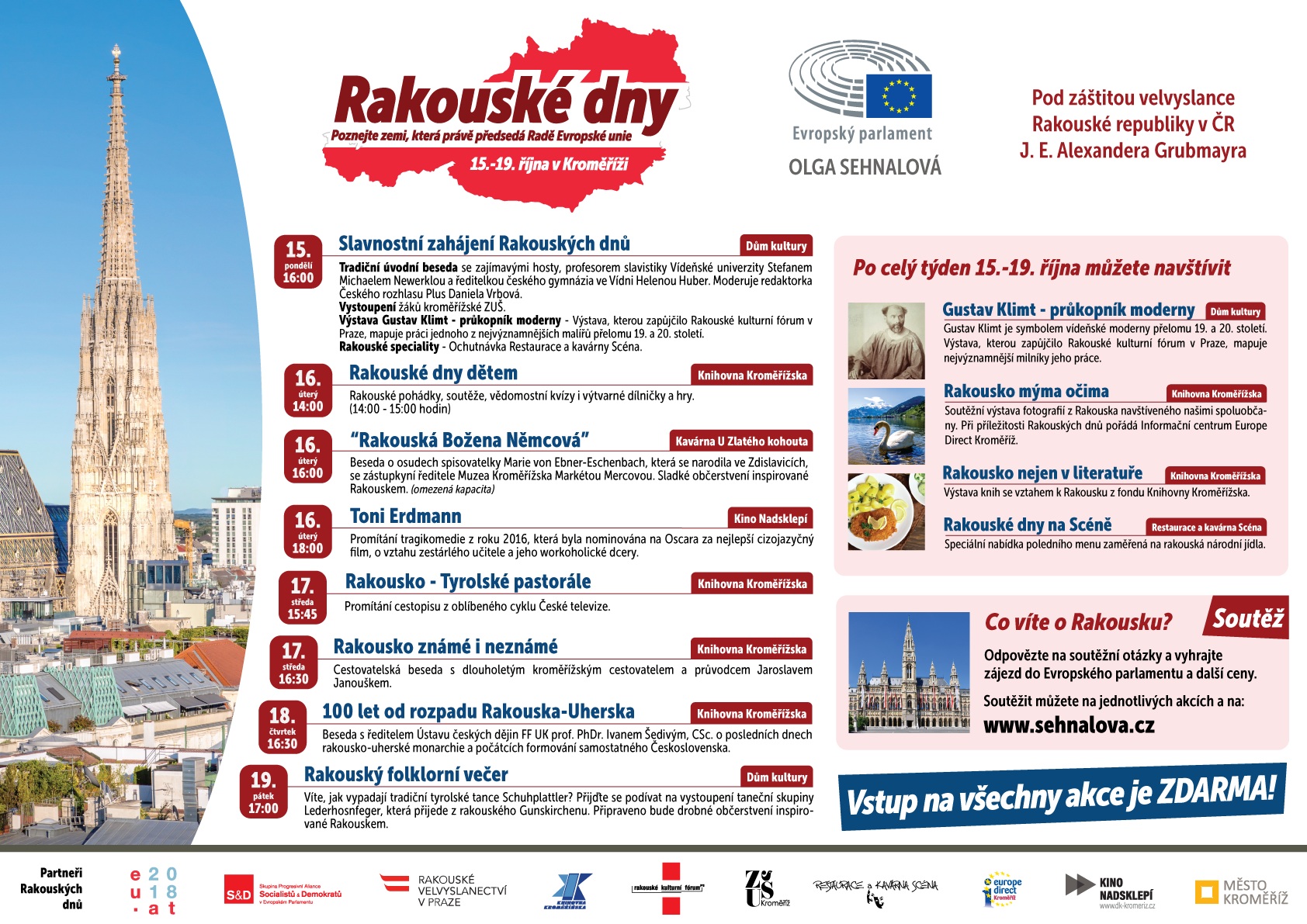 S Rakouskem nás pojí dlouhá společná historie, mnoho významných osobností, ale třeba i vídeňský řízek a linecké cukroví. I když tato země patří mezi nejoblíbenější cestovatelské cíle, pojďme společně objevit zajímavosti, o kterých jsme jako běžní návštěvníci dosud netušili. V Kroměříži je představí Rakouské dny, které bude od 15. do 19. října pořádat poslankyně Evropského parlamentu Olga Sehnalová pod záštitou velvyslance Rakouské republiky v ČR Alexandera Grubmayra. Bude to již sedmnácté pokračování "Evropských dnů" věnovaných zemi, která právě předsedá Radě Evropské unie.