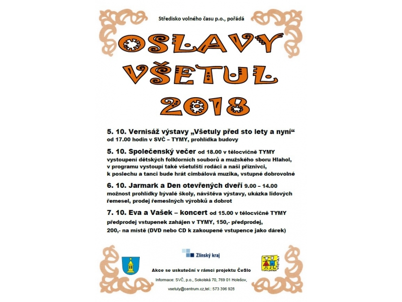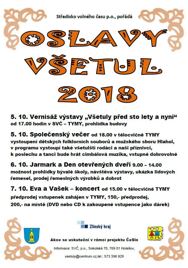 Již dnes tak můžete v 17:00 hodin ve středisku volného času TyMy navštívit vernisáž výstavy Všetuly před sto lety a nyní. V tělocvičně tohoto střediska pak o hodinu později proběhne společenský večer. Budete mít možnost zhlédnout vystoupení dětských folklorních souborů a mužského sboru Hlahol. V programu vystoupí také všetulští rodáci a hrát bude cimbálová muzika. Vstupné na akci je dobrovolné.