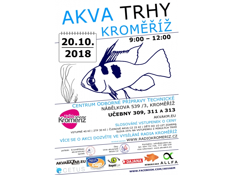 Žádný chovatel akvarijních rybiček by si neměl nechat ujít kroměřížské AKVA trhy! Ty nejbližší se budou konat 20. října v budově Centra odborné přípravy technické. V prvé řadě nabídne prodej rybiček a sortimentu akvaristických potřeb. Během tohoto sobotního dopoledne proběhne ale také slosování vstupenek o ceny.