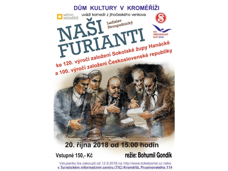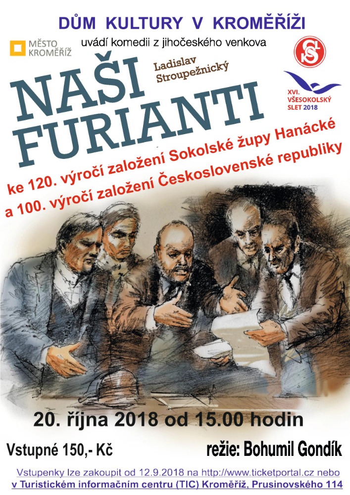 V sobotu 20. října uvidíte v kroměřížském Domu kultury známou divadelní hru Naši furianti z pera Ladislava Stroupežnického. Toto komediální představení se uskuteční u příležitosti 120. výročí založení Sokolské župy Hanácké a 100. výročí vzniku Československa.