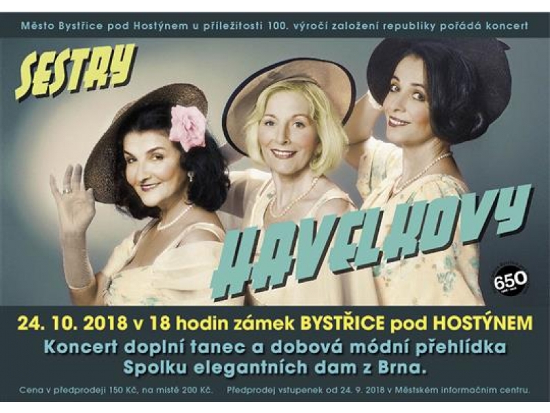 Město Bystřice pod Hostýnem pořádá u příležitosti 100. výročí založení republiky hudební vystoupení Sester Havelkových. Koncert se uskuteční ve středu 24. října v 18 hodin na bystřickém zámku a Sestry Havelkovy doprovodí hudba jejich bandu.