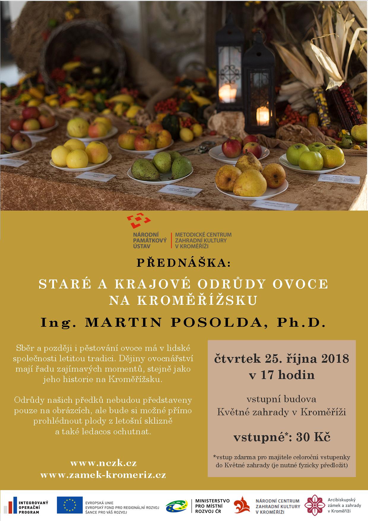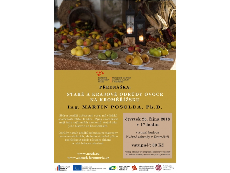 Přednášet o odrůdách ovoce, které se na Kroměřížsku pěstovaly v minulosti, vám bude Ing. Martin Posolda, Ph.D., specialista na staré a krajové odrůdy ovoce. Akce se koná již tento čtvrtek 25. října od 17:00 hodin v přednáškovém sále kroměřížské Květné zahrady. Vstupné na ní činí 30 Kč, ale pro držitele celoroční vstupenky do Květné zahrady je po předložení zdarma.