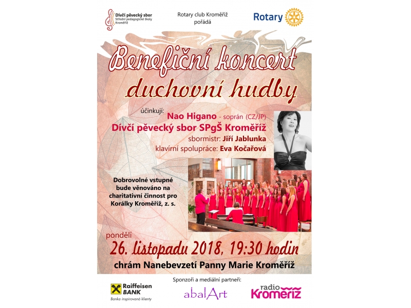 Přijďte v pondělí 26. listopadu na Benefiční koncert duchovní hudby, který se bude konat v chrámu Nanebevzetí Panny Marie v Kroměříži. Vystoupí na něm česko-japonská sopranistka Nao Higano a Dívčí pěvecký sbor Střední pedagogické školy Kroměříž. Vstupné je dobrovolné a samozřejmě jím pomůžete na dobrou věc. Mediálním partnerem této akce je Radio Kroměříž.